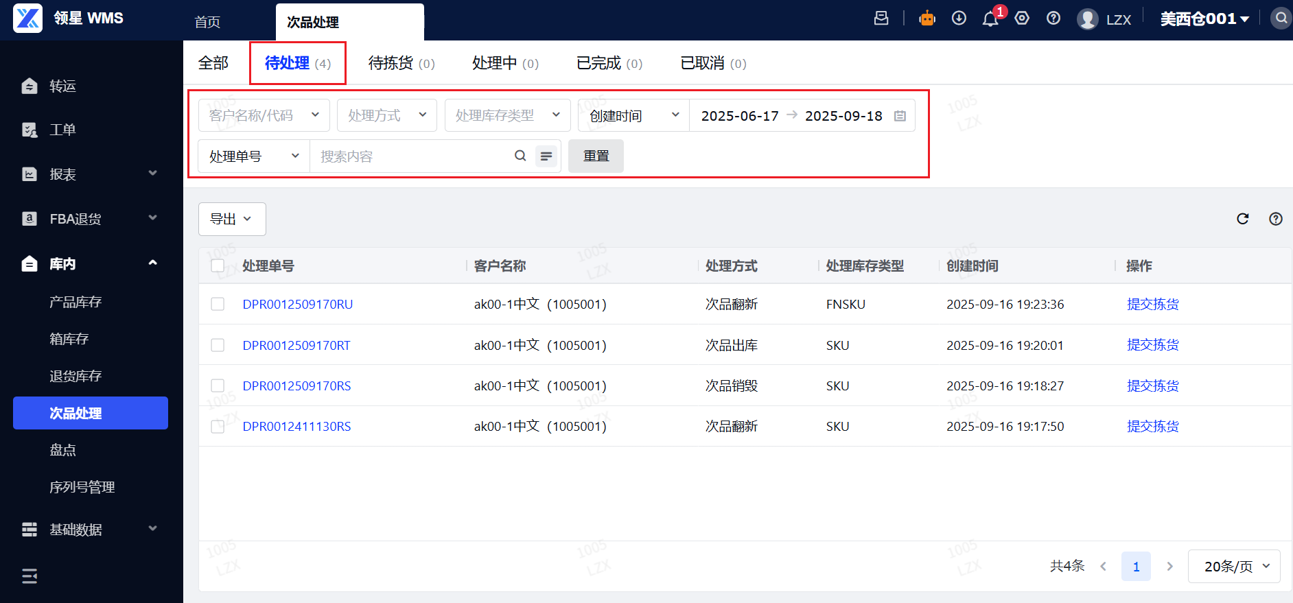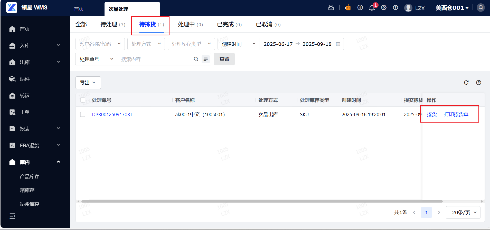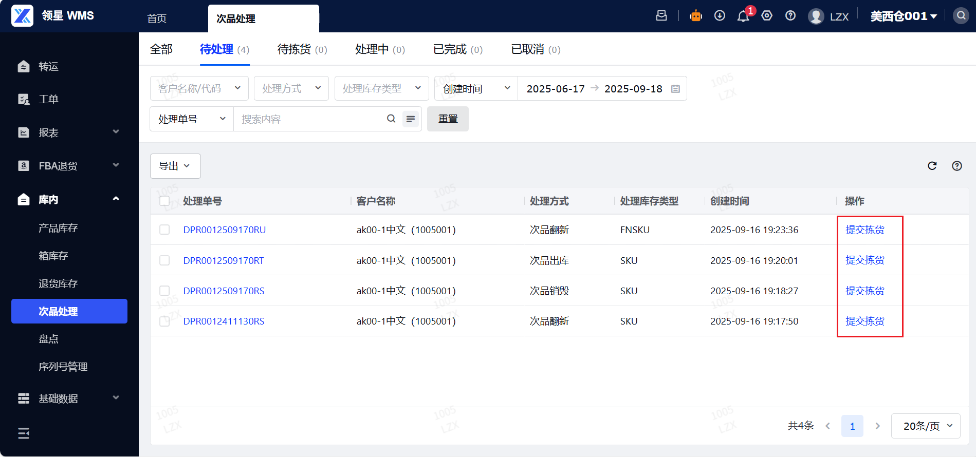 (4)提交次品处理单据进行拣货:在待处理状态下,定位到需要处理的次品单据,并点击右侧的提交拣货。