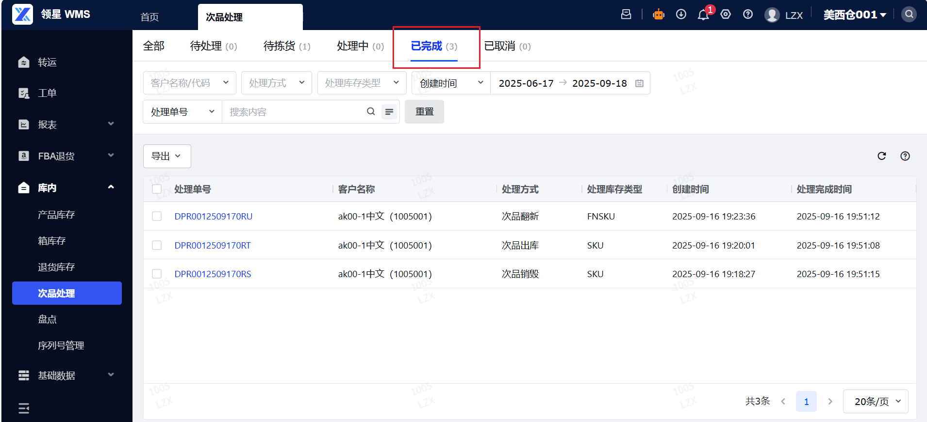 (7)次品处理完成:定位到已完成状态下,单据出现在该列表,代表次品处理完成。