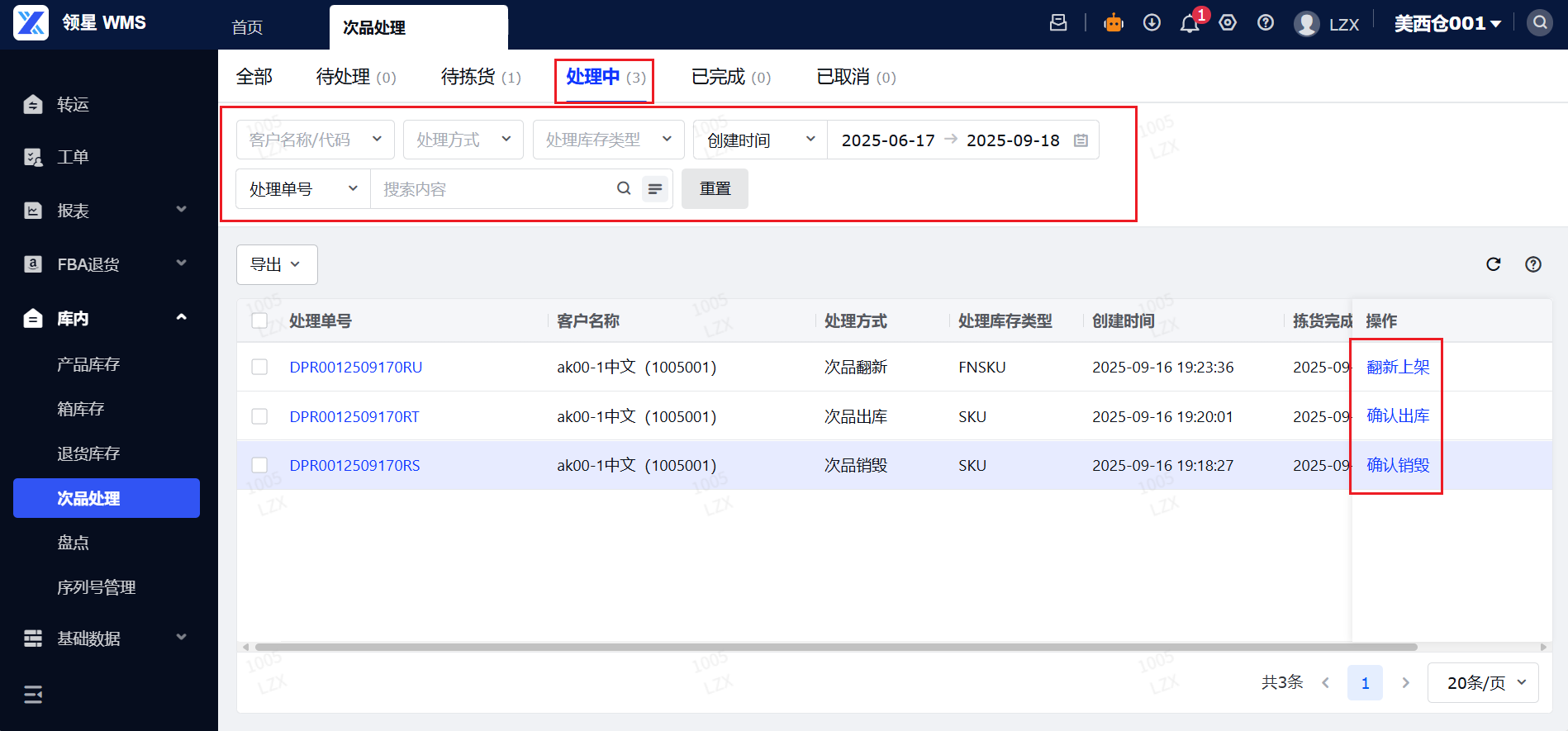 (6)进行次品处理:定位到处理中状态下,可以对单据进行筛选,点击操作处的按钮,如:确认上架、确认出库、确认销毁,进行相应的次品处理。