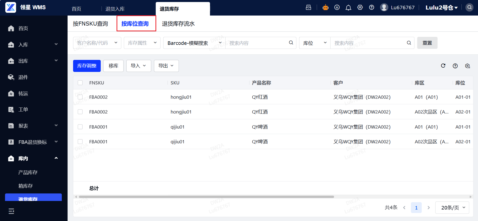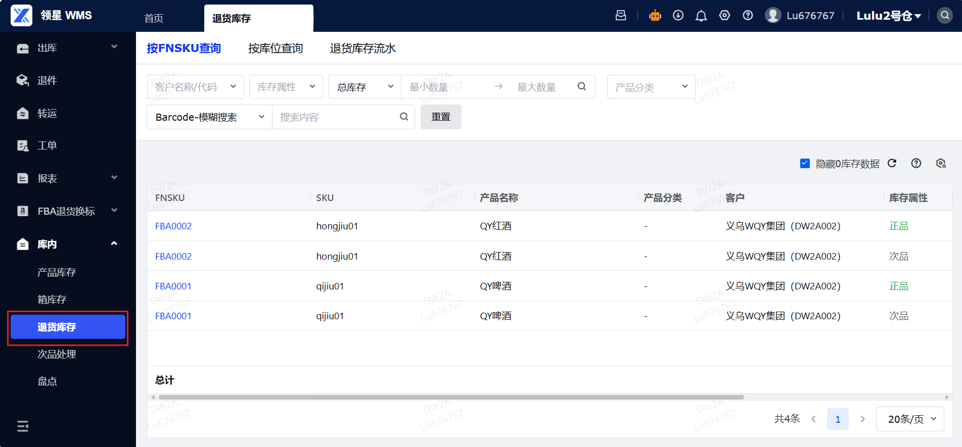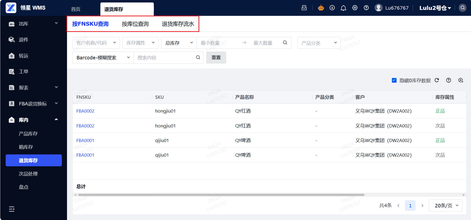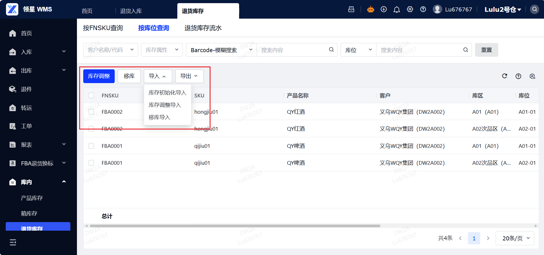 定义:退货库存是指通过领星OMS端口选择FBA退货入库的货物。作用:该功能主要用于准确记录FBA退货库存的货品数据信息,使仓库人员能够及时对退货库存的数量、属性等进行核查与调整,确保库存数据的真实性和准确性。