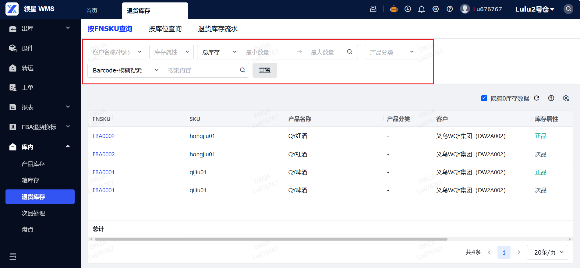 (4)退货库存查询:点击对应的筛选条件进行筛选,键盘回车就可以实现退货库存查询。