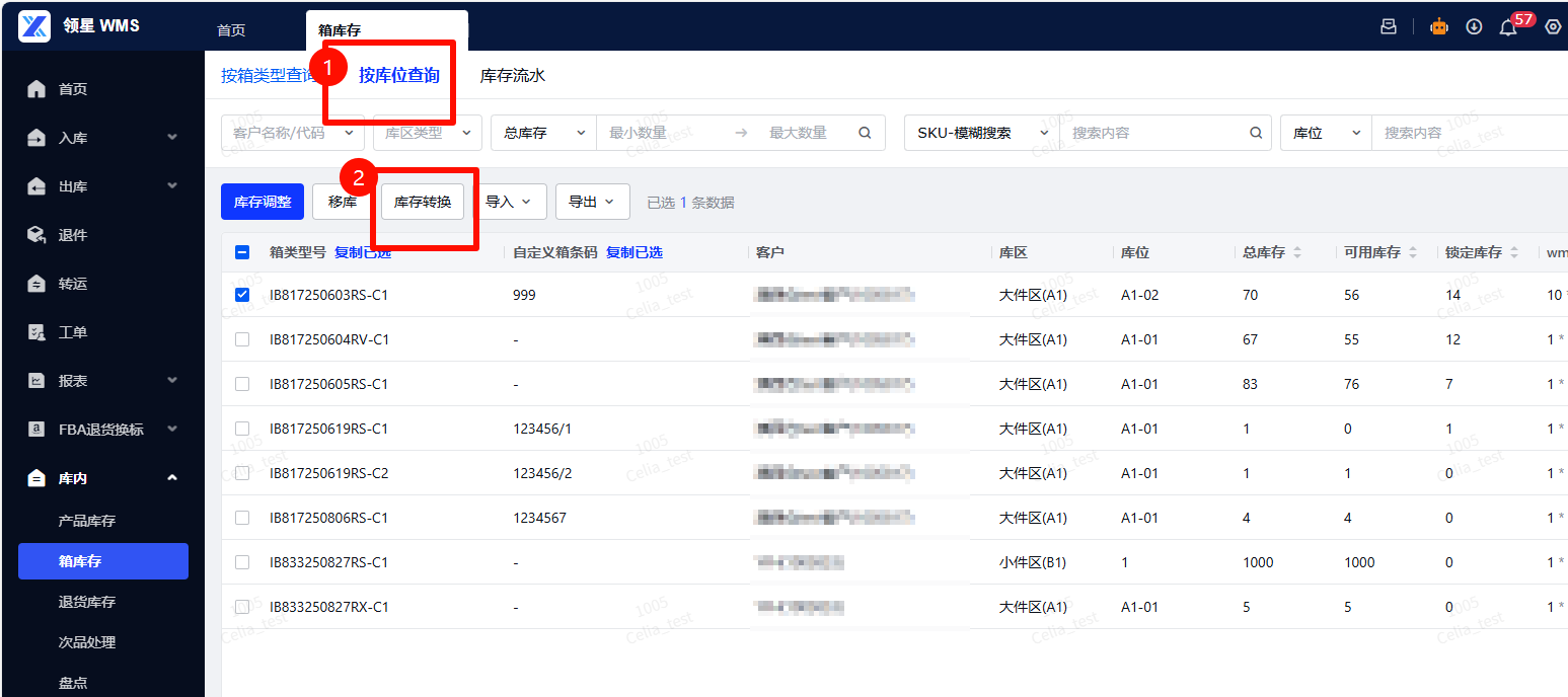 当客户想要把原本准备做备货中转的产品、转做一件代发业务时,我们我们可以使用库存转换功能,将箱库存转换成产品库存。路径:【库内】-【箱库存】-【按库位查询】-【库存转换】第一步:勾选需要调整的SKU,点击【库存转换】,也可以搜索需要调整的SKU再进行勾选
