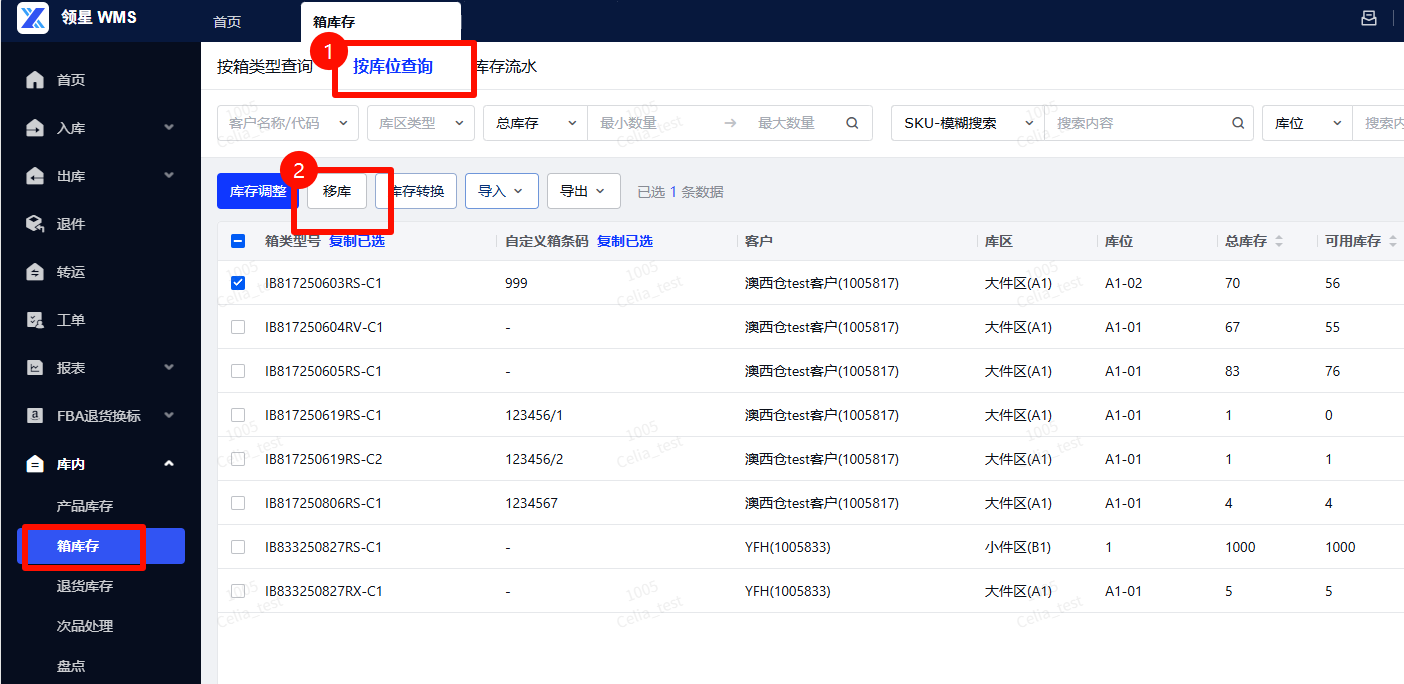 路径:【库内】-【产品库存】-【按库位查询】-【移库】第一步:选择要调整库位的SKU,点击【移库】按钮