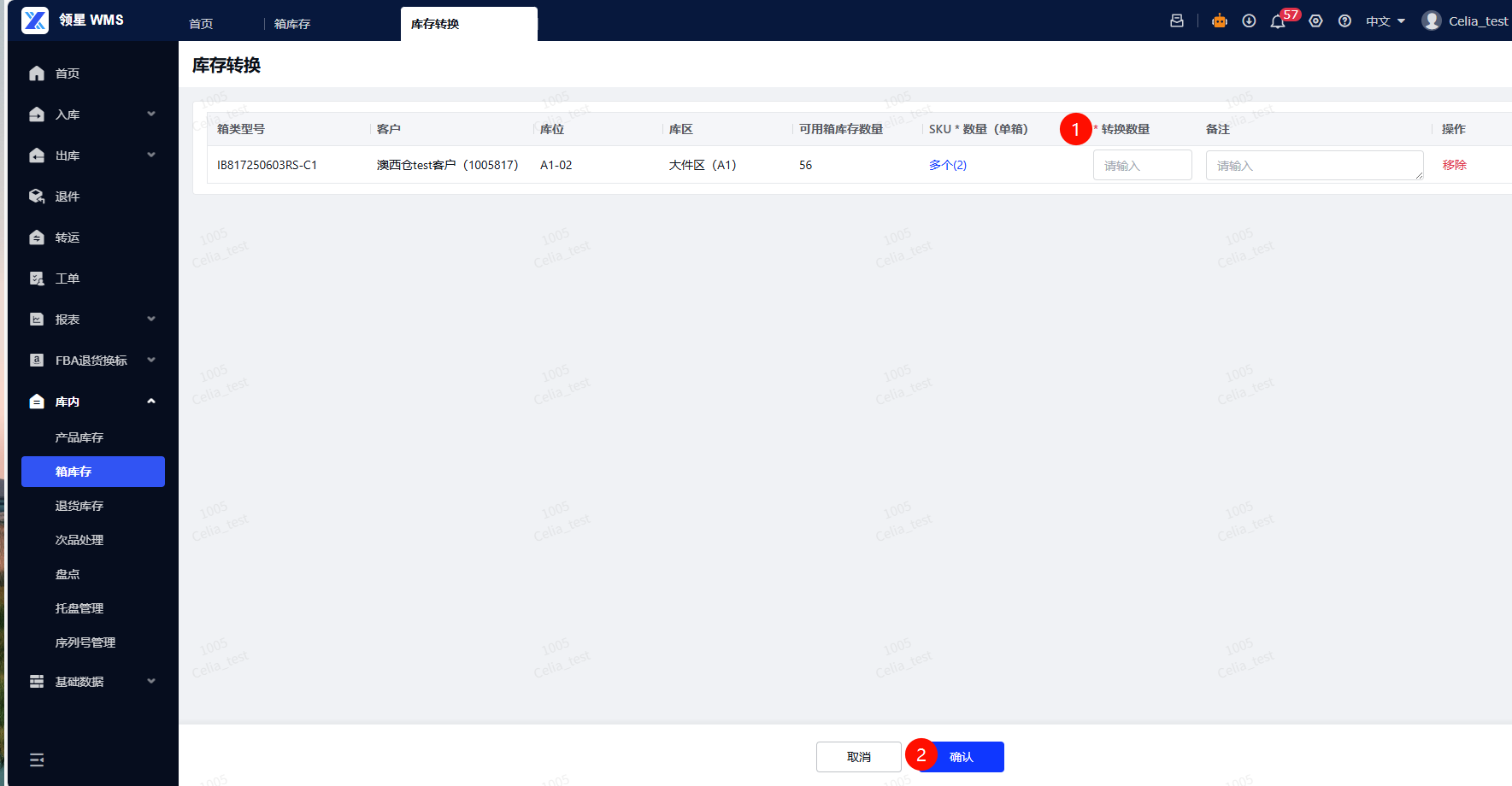 第二步,在【转换数量】字段下输入需要转换的箱数,然后点击【确认】。系统会自动生成库存调整的变动流水,同时会同步至OMS,并在OMS中生成同样的库存流水。