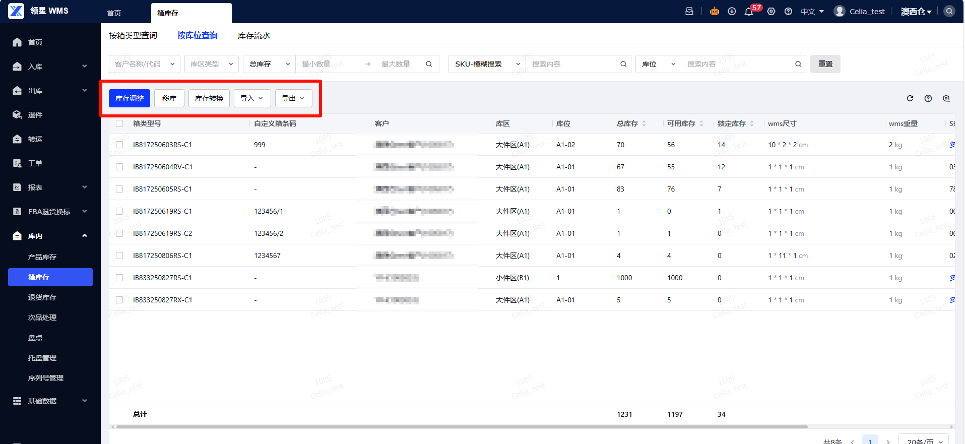 (3)点击按库位查询库存时,会出现【库存调整】、【移库】、【导入】、【导出】等功能。