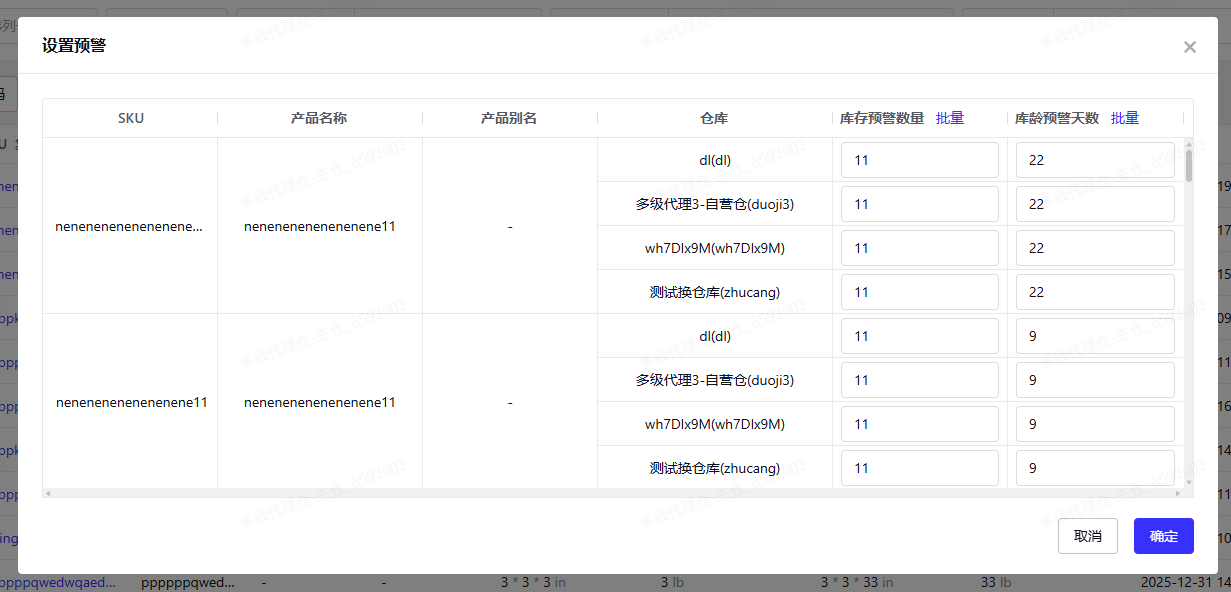 (b) 批量设置:在产品列表中新增【设置预警】批量操作按钮,支持批量给产品设置预警数量和预警天数。