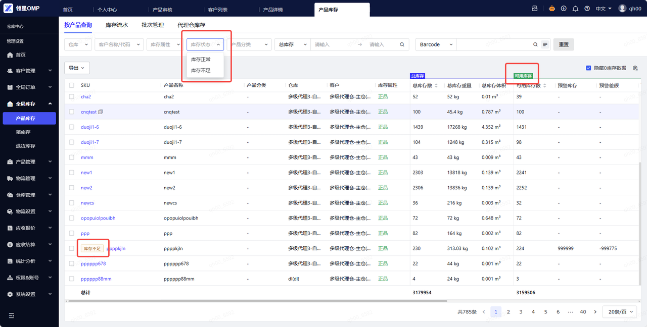 2.1 产品库存:在产品库存表中,若某SKU的可用库存小于设置的预警值,会被打上【库存不足】的标签,并支持把库存不足的SKU全部筛选出来。