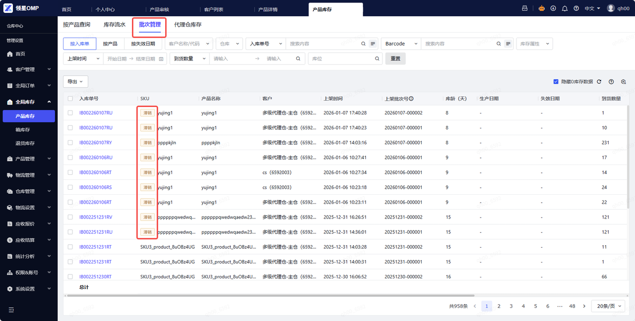 2.2 批次库存-库龄:在批次库存表中,若某条批次库存的库龄天数大于设置的预警值,会被打上【滞销】的标签。