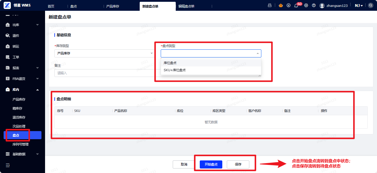 (2)新建盘点单:导航至盘点菜单,点击新建盘点单按钮。填写对应数据之后点击开始盘点/保存。