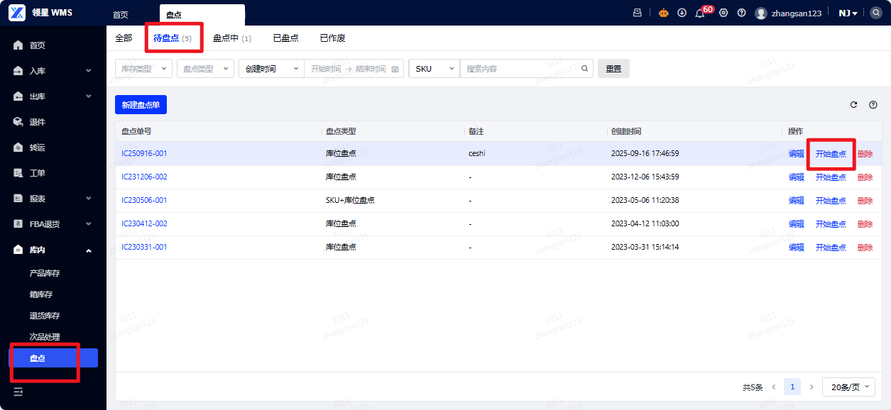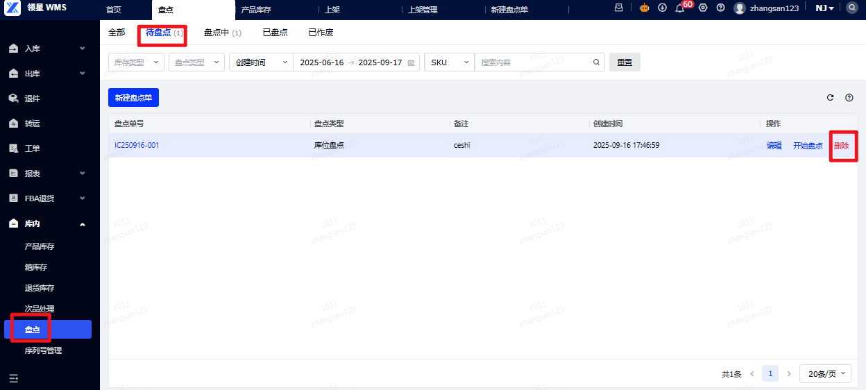 答案:目前仅有在待盘点状态下支持删除。可参考下图