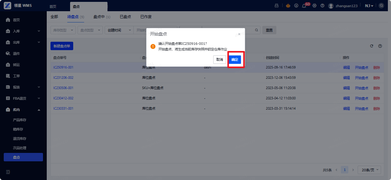 (3)开始盘点:导航至盘点菜单,待盘点状态下,点击开始盘点。弹出的弹窗点击确定。