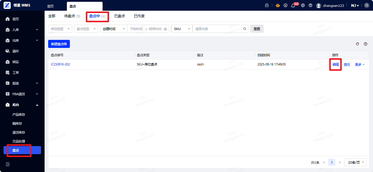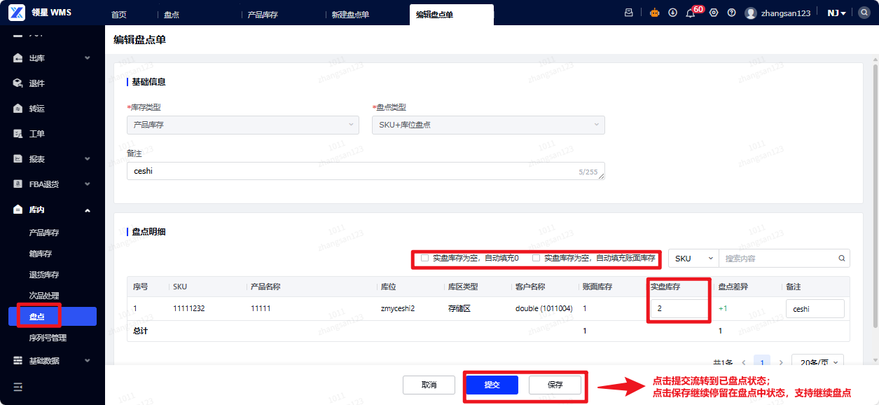 (4)填写盘点数据:导航至盘点菜单,盘点中状态下,点击编辑,填写对应盘点的数据,点击提交/保存。