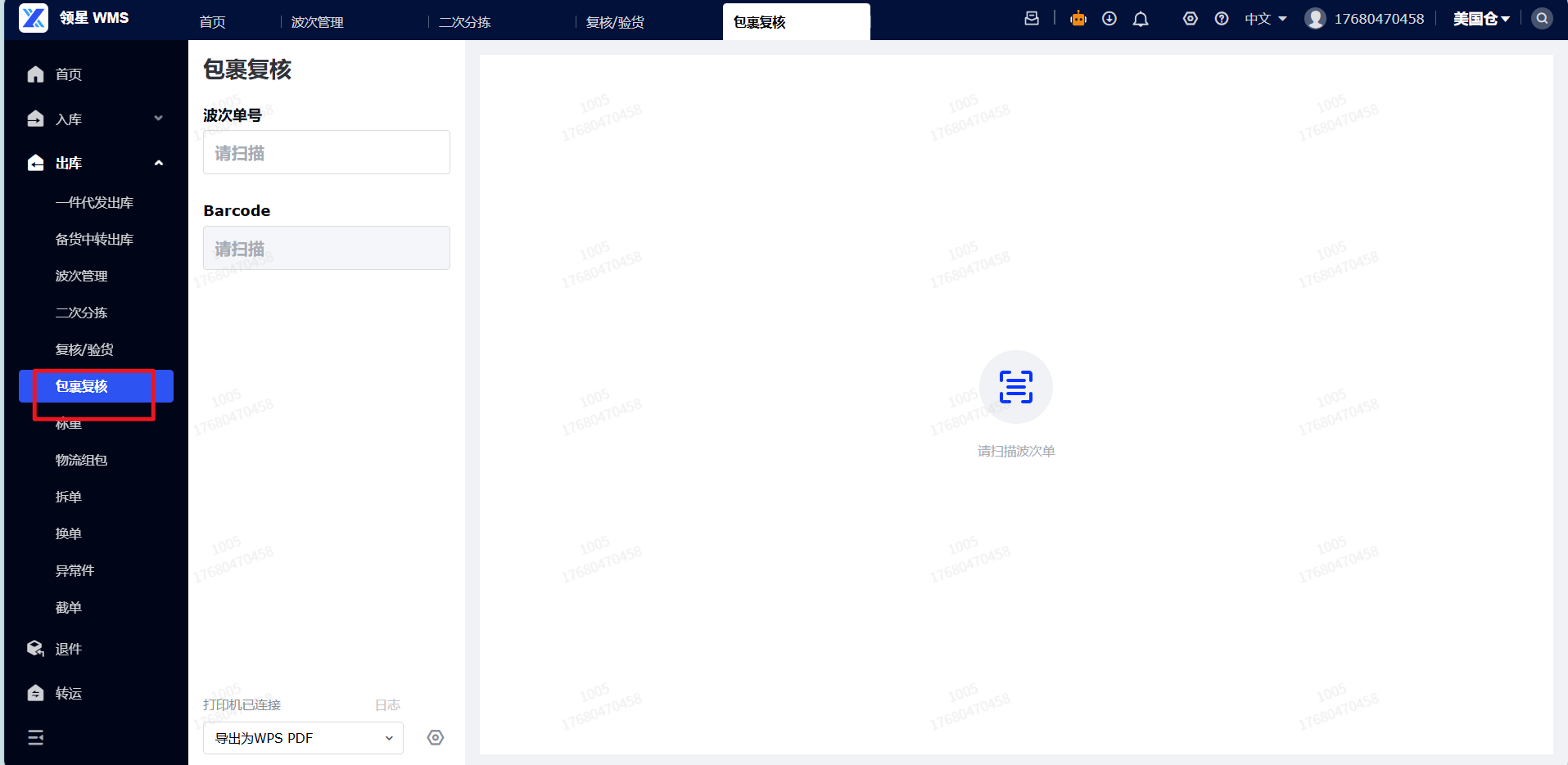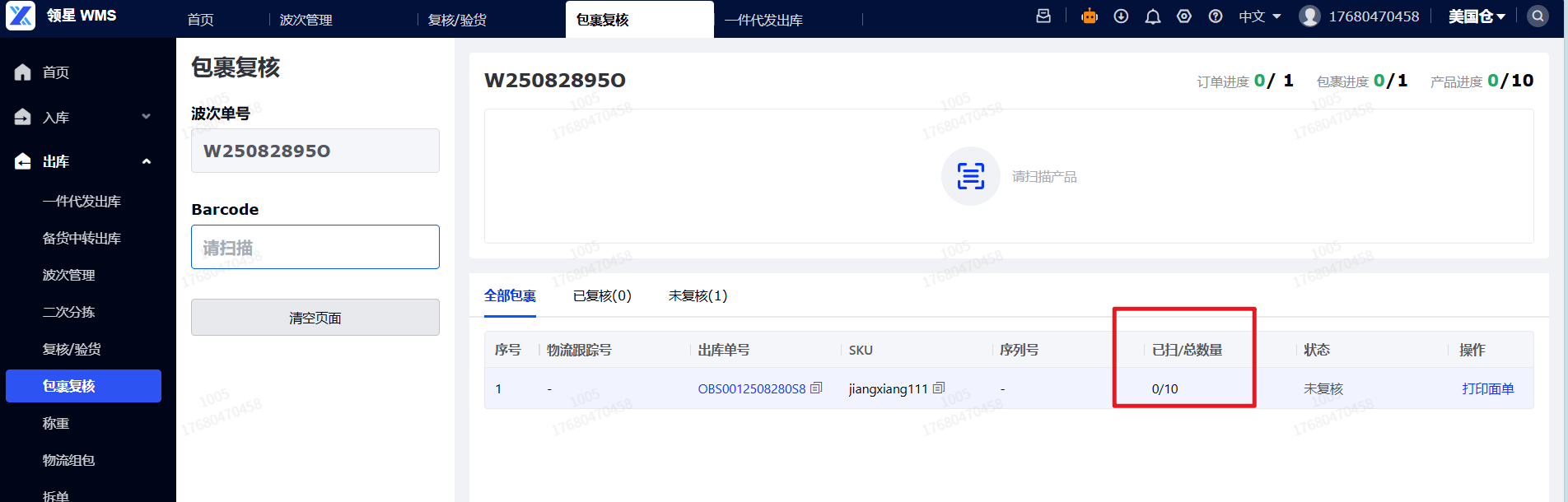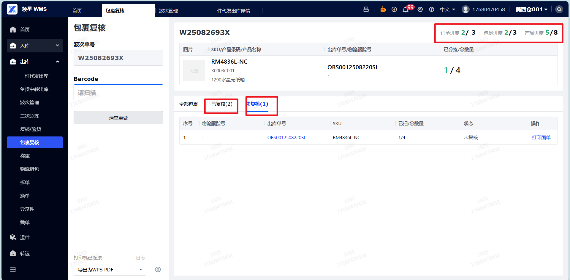 (4)进行包裹复核:扫描波次单号和条码。可查看当前已复核和未复核包裹数量。并依次以订单、包裹和产品的维度展示当前扫描复核的数量,以及这个波次的总数量。