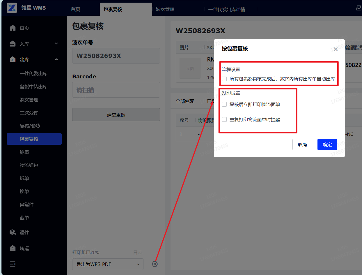 (3)按需进行流程和打印设置:操作包裹复核前,点击下方设置,可按您仓库需求勾选对应设置,点击确认即可对新单据生效。