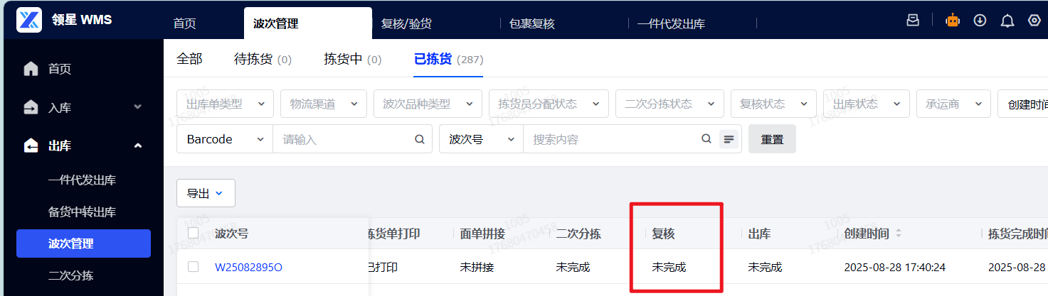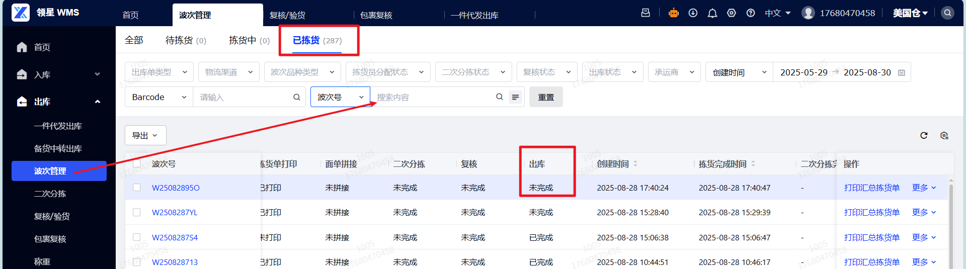 Q1:扫描波次号,提示:请检查波次单号,仅支持扫描【已拣货】且【未出库】的波次单
