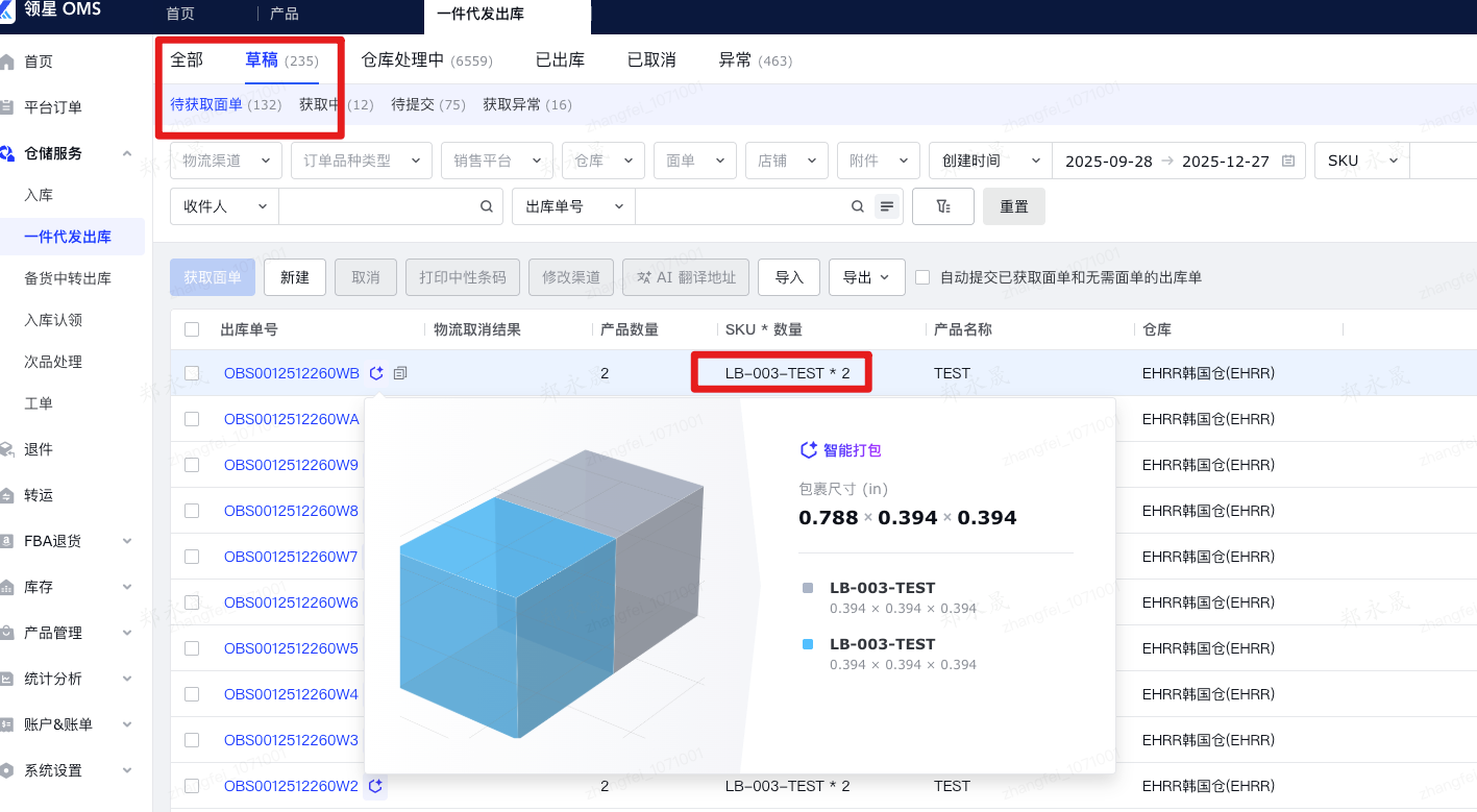 2. 针对开启设置后的订单,在OMS创建单据时,如SKU数量>=2,将自动应用【领星智能算法】计算最优包裹尺寸,并生成打包示意图。