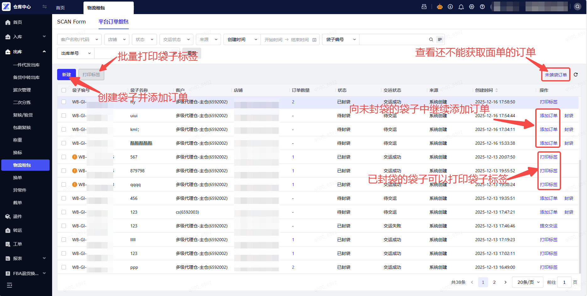 (3)仓库订单组包:在【出库-物流组包】菜单下新增【平台订单组包】tab,可在该功能下进行袋子创建、向袋子内添加订单、系统自动获取面单、手动打印袋子标签等操作。