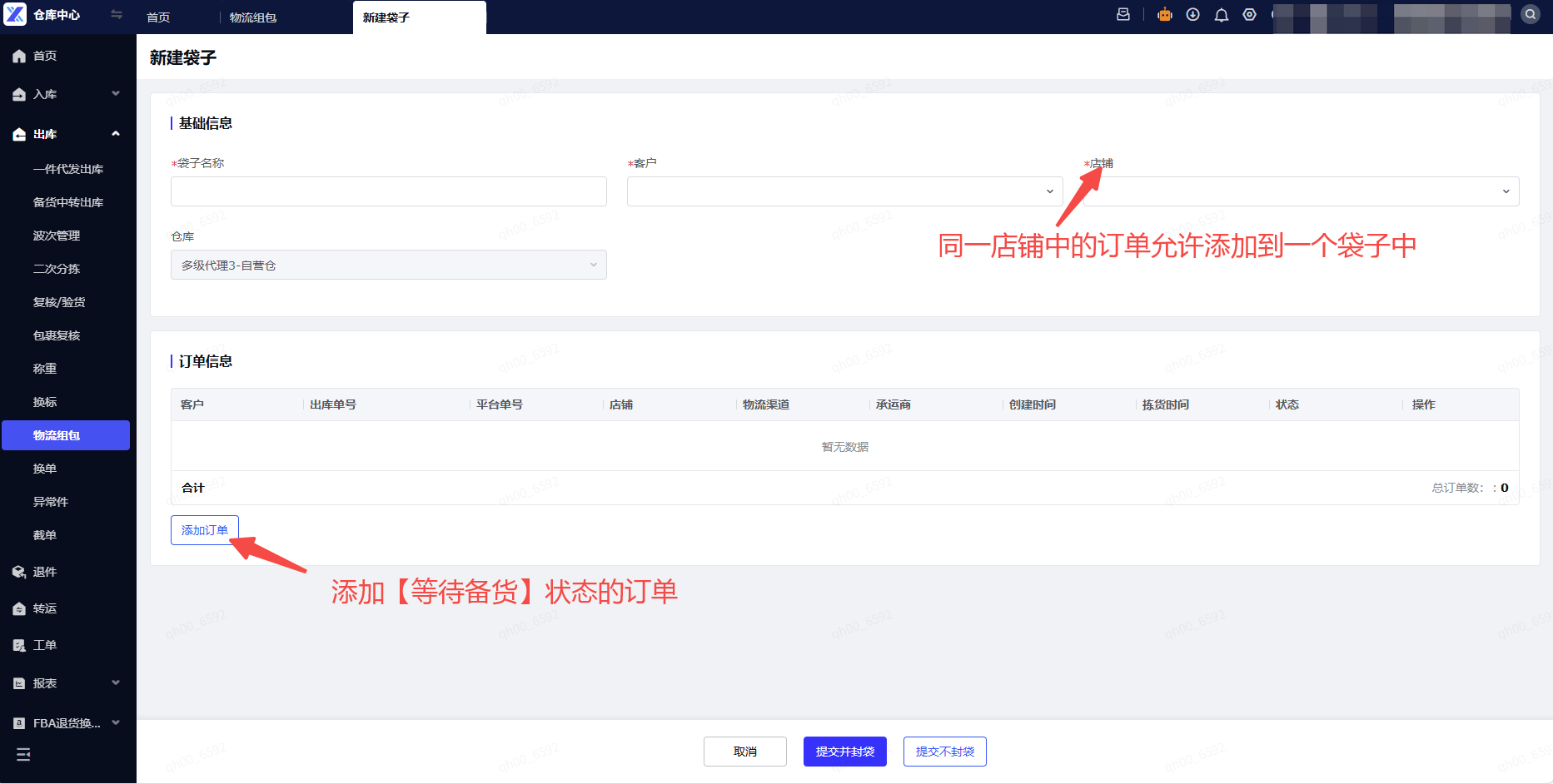 (2)袋子:系统把订单组包概念中涉及的【大的箱子】命名为【袋子】。