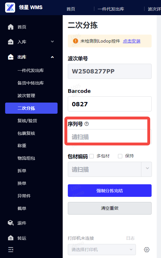需要扫描对应的SKU条码和序列号进行分拣。二次分拣后,序列号将关联对应出库单。在WMS-库存—序列号管理表中可以看到对应序列号的“关联出库单”,对应出库单的详细页也能看到关联的序列号信息。