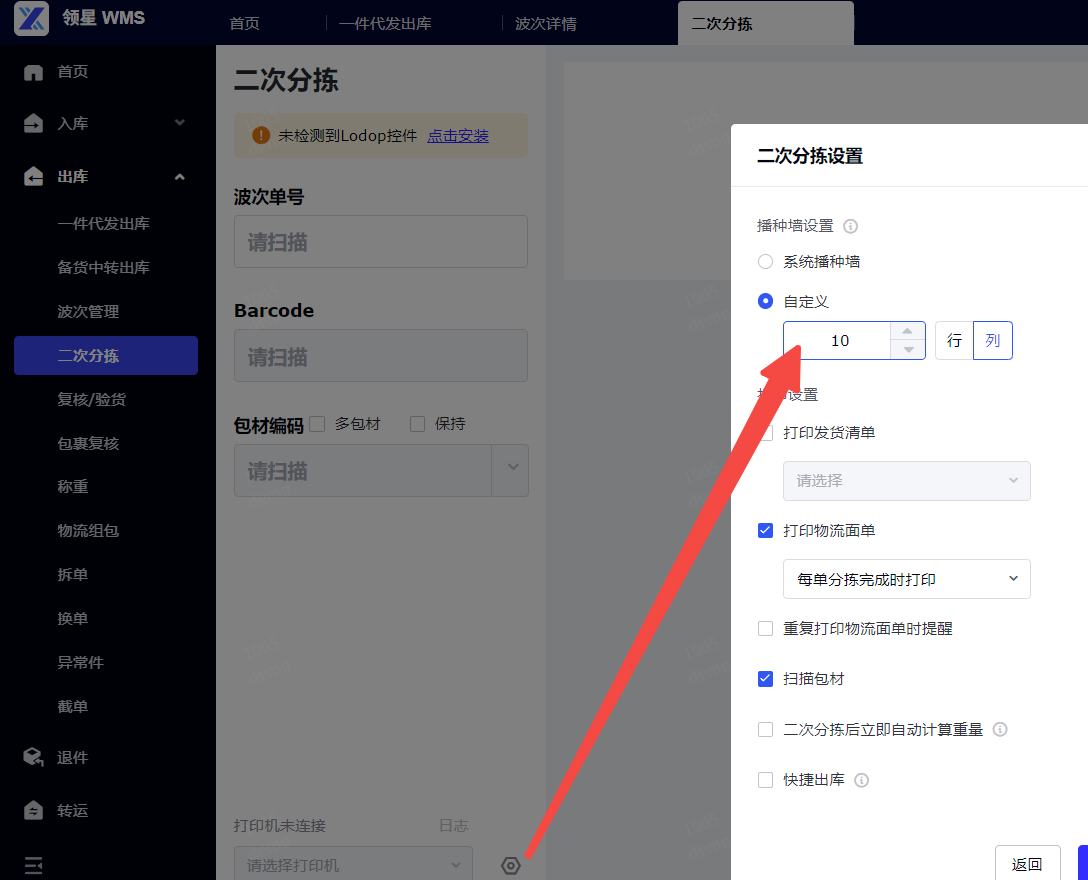 首次操作时,请按照扫码枪的说明书正确安装驱动,连接您的电脑。进入WMS-二次分拣页面先安装打印控件。下载后,在页面底部的齿轮按钮可以进行打印设置,可选择系统播种墙或自定义播种墙。
