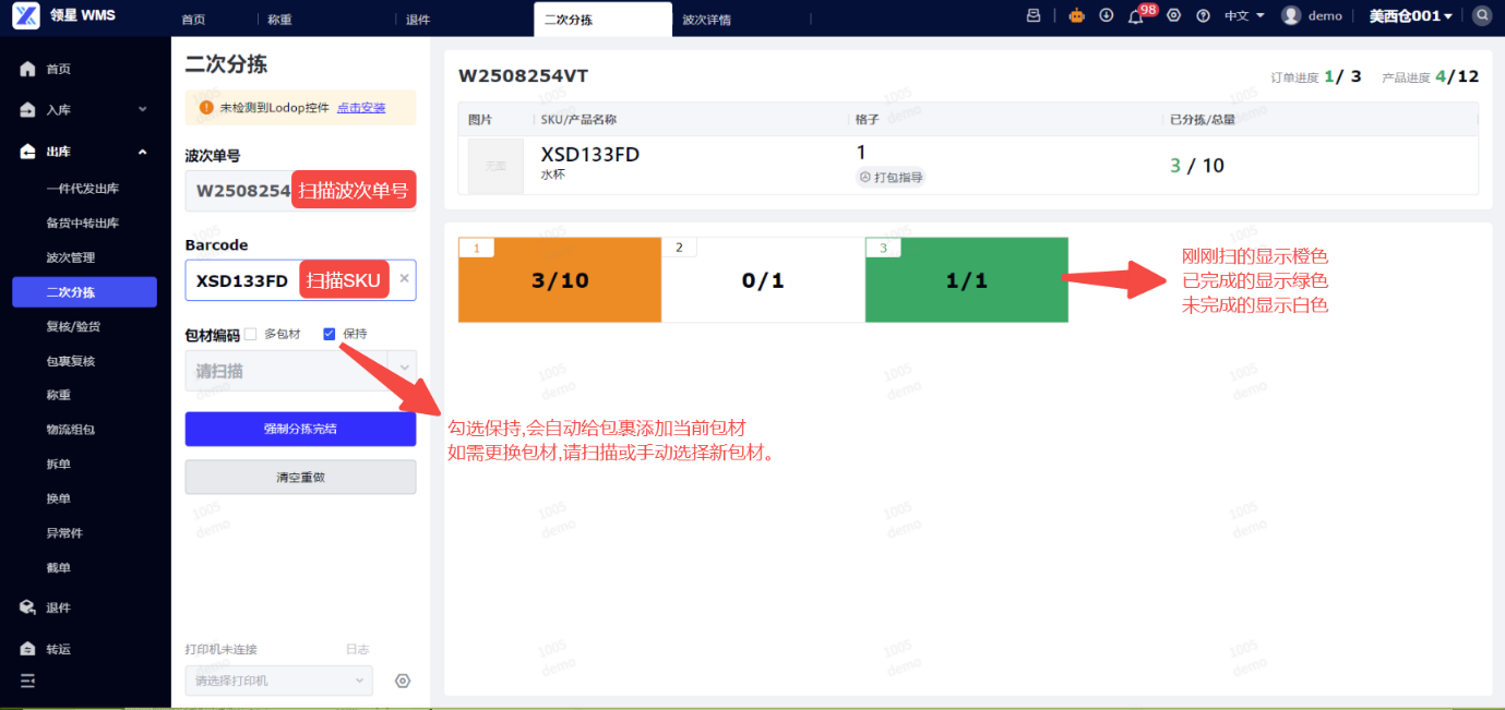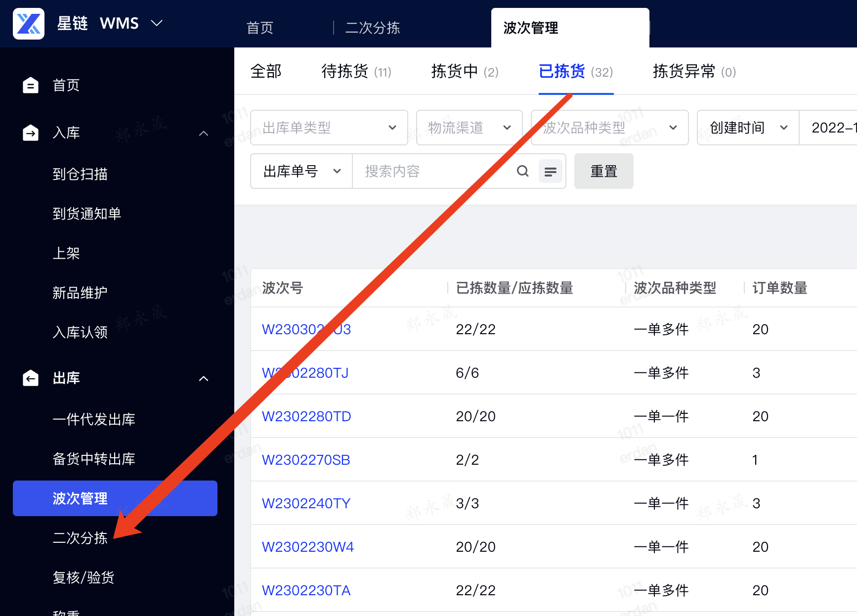 (1)准备与设置: 波次管理状态为已拣货的波次,可进行二次分拣;