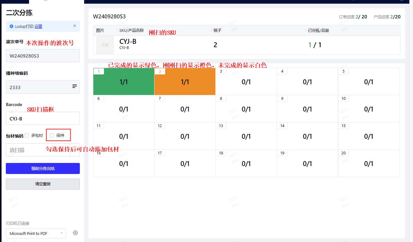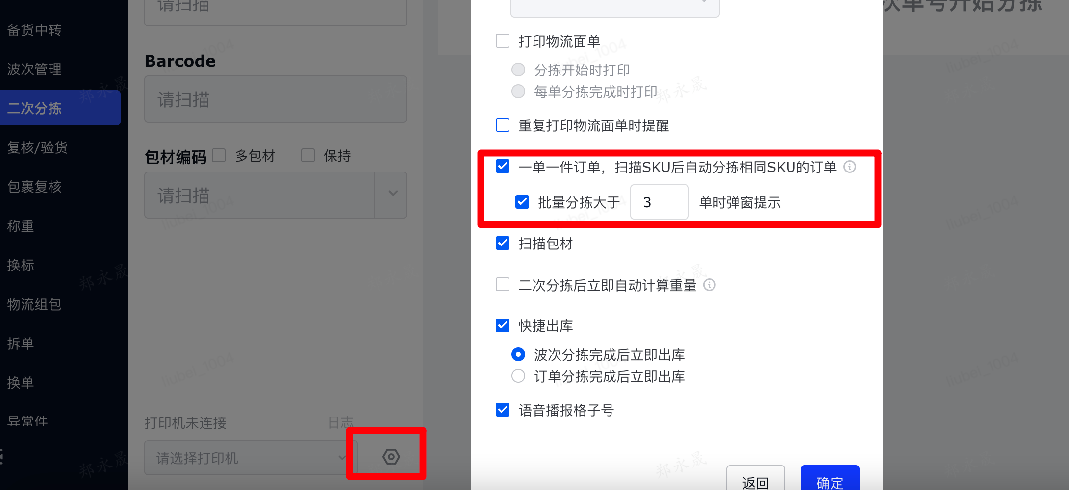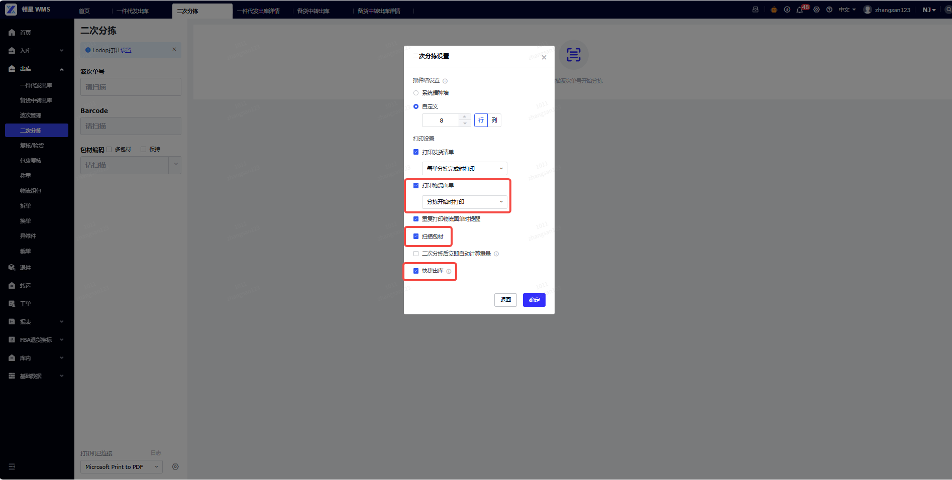 在处理一单多件类型的波次时,需先完成该波次下所有包裹对应商品的拣货操作;待商品拣选完成后,再通过【二次分拣】,将商品精准匹配至对应包裹。另外在操作前,可以配置分拣过程中同步开展包装作业及打印物流面单,完成后自动更新为已出库状态。