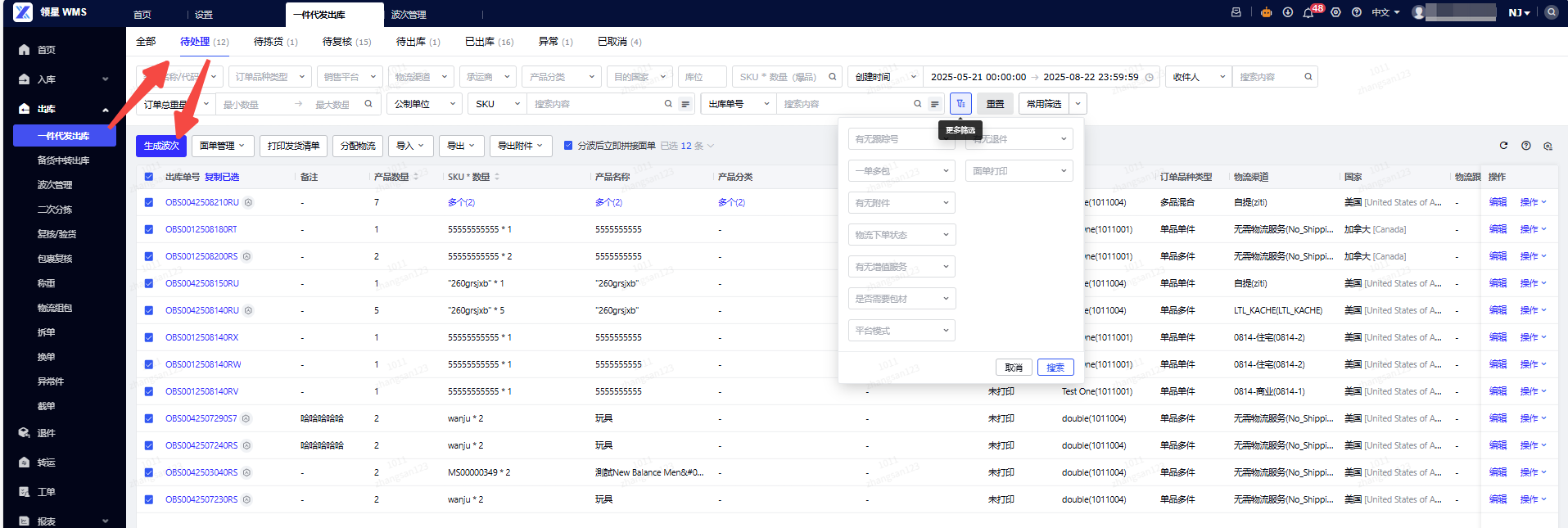 OMS提交到仓库的出库单,会进入到”待处理“状态中。仓库可以根据实际运营场景,先对当日要处理的订单进行筛选,勾选指定条件的订单点击生成波次(单个波次最多支持500个订单)