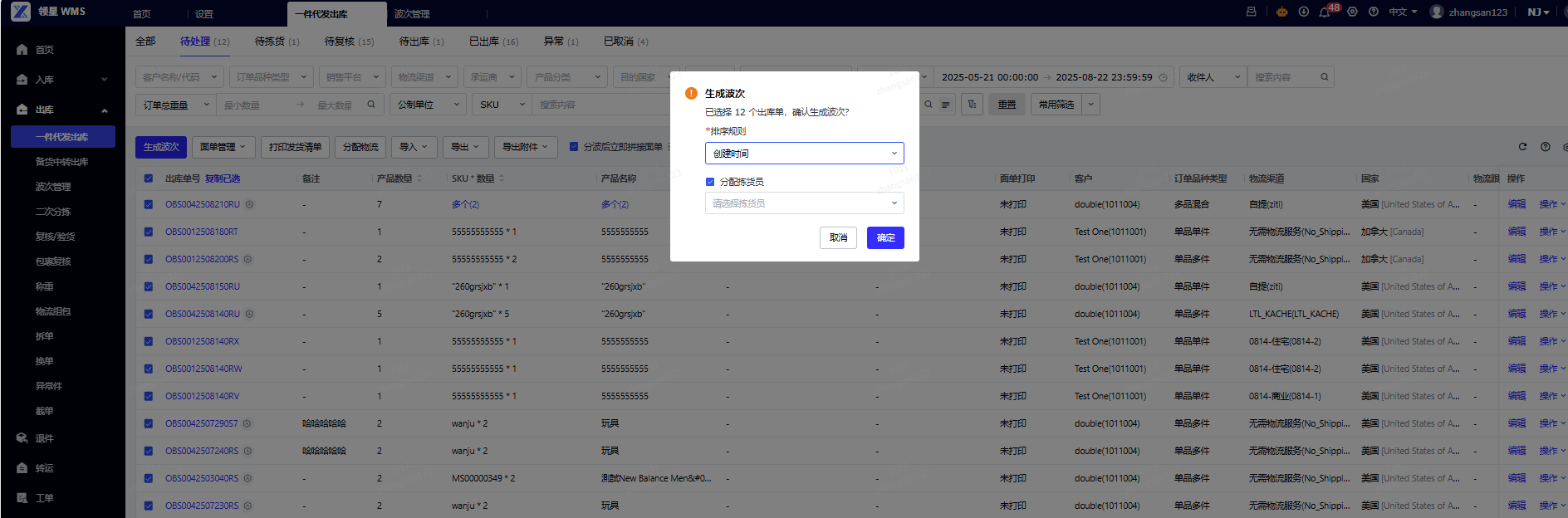 在生成波次时,系统支持配置排序规则,可按创建时间、SKU、承运商或库位等维度对出库单进行排序,并在波次详情页中按规则展示。此外,支持为当前波次分配拣货人员,指定具体操作人员负责该波次的拣货作业。
