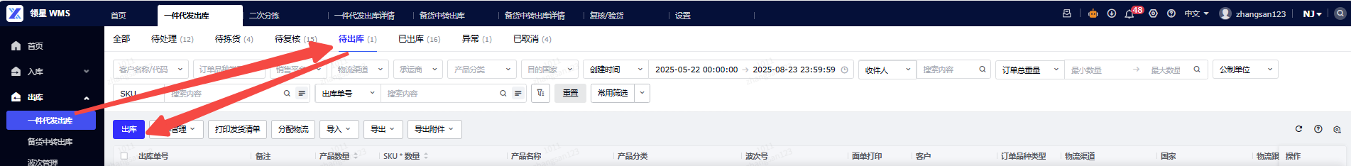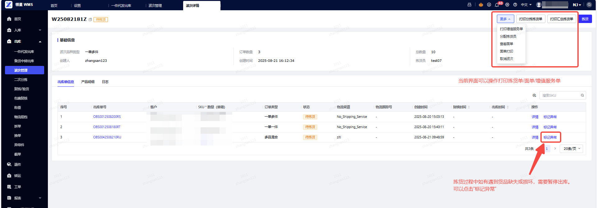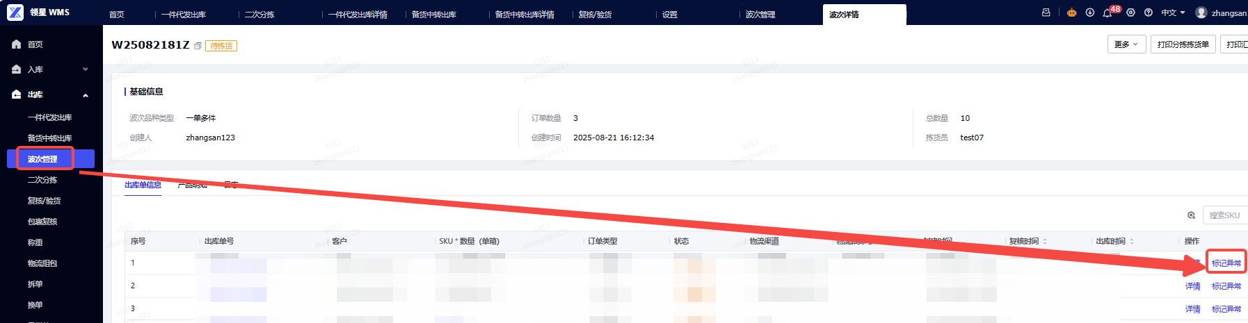 如果出库单为“待拣货”状态,需要在波次管理中,点击波次号进入详情页内操作【标记异常】