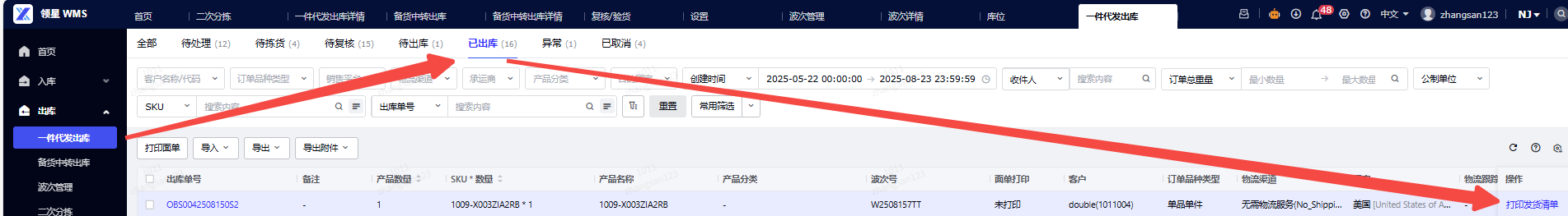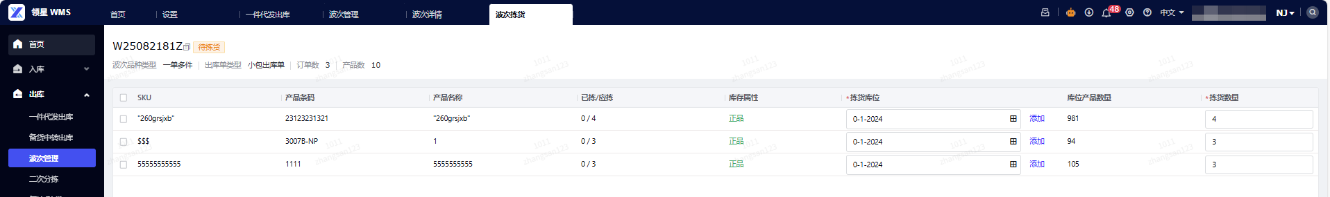 新生成的波次单,会进入【波次管理】”待拣货“状态。仓库可以在此界面打印拣货单/面单/增值服务单,配合后续拣货操作。