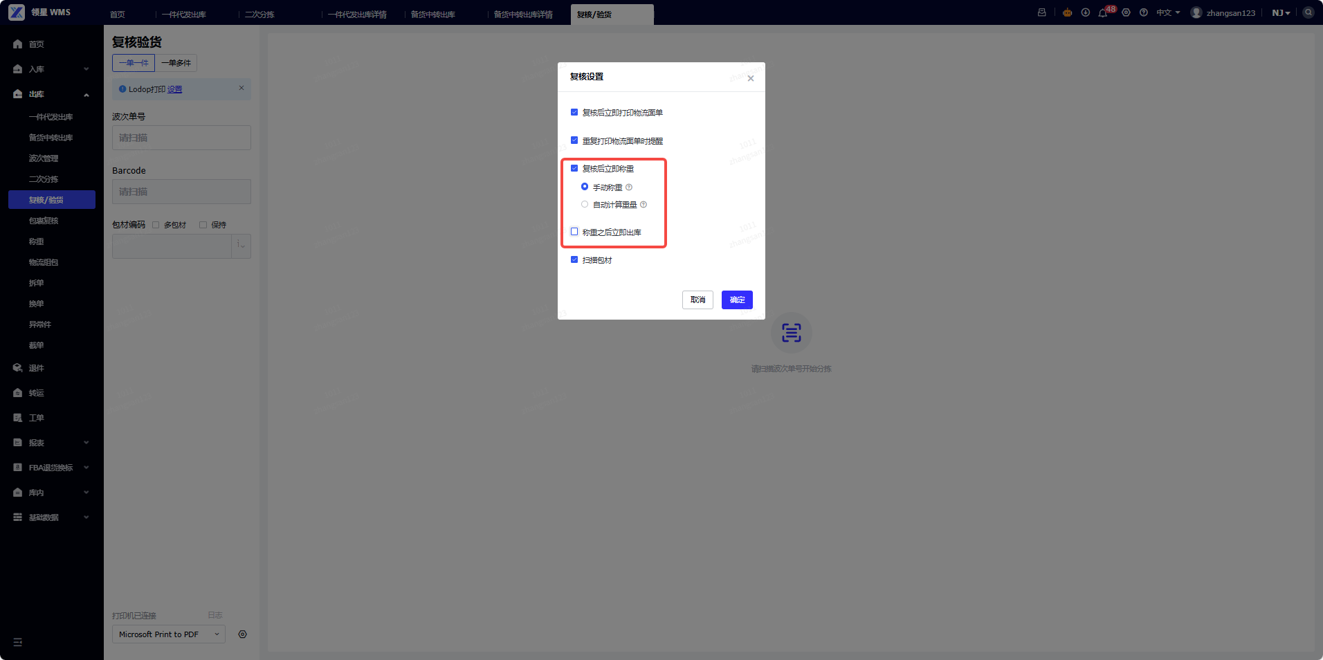 在处理一单一件类型的波次时,按该波次的对应产品汇总拣出后,使用【复核验货】功能,扫描产品条码,打印对应包裹的物流面单,完成打包出库。在操作前,可以配置复核过程中同步开展包装作业及称重出库,完成后自动更新为已出库状态。