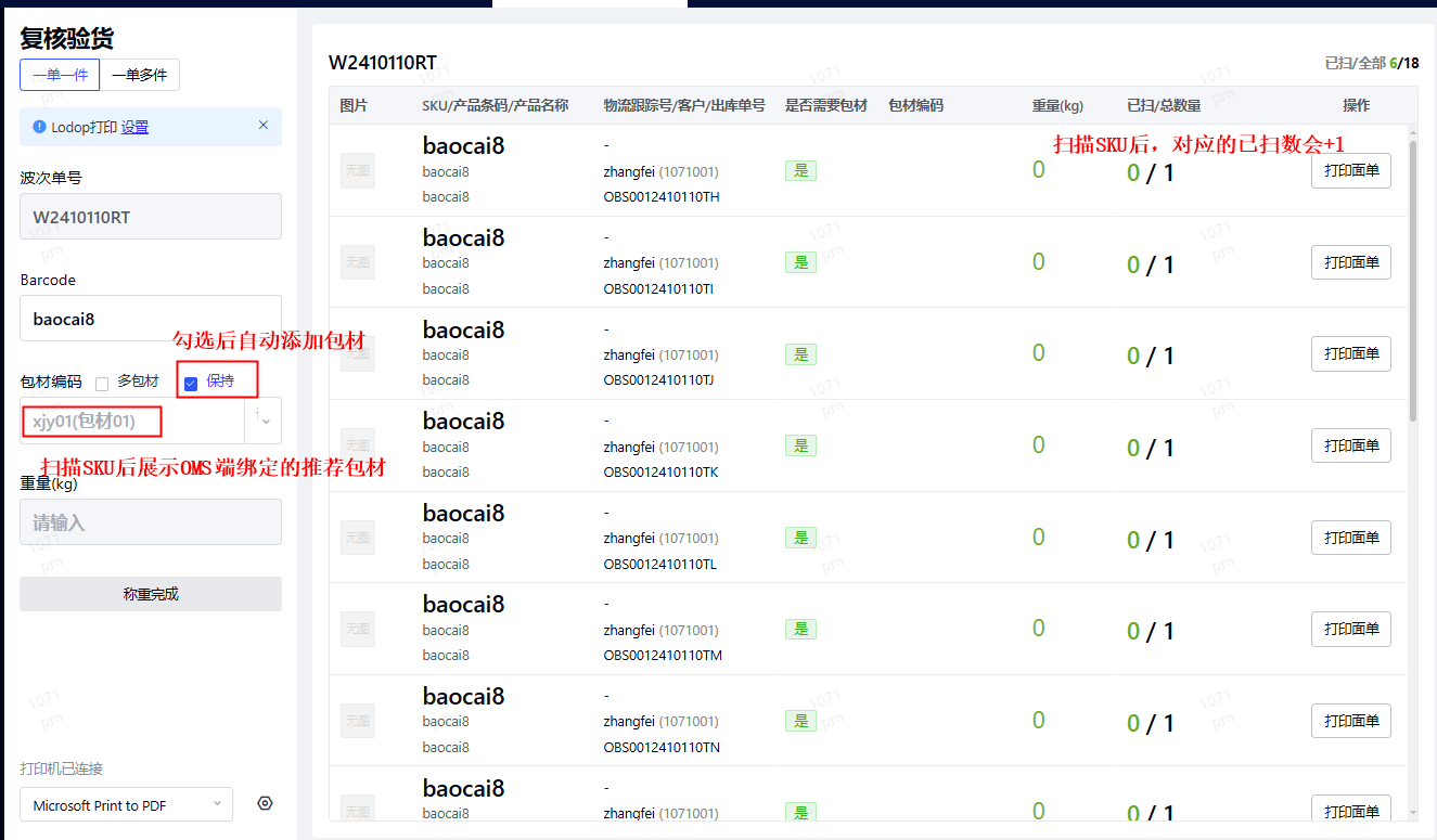 配货人员打开【复核验货】界面,扫描”汇总拣货单”的波次号条码,扫描SKU的条码,系统匹配到订单后,自动通过打印机打印出一张物流标签。