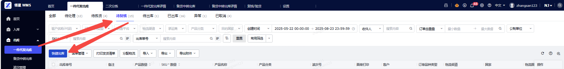 【二次分拣】或【复核验货】均支持配置完成操作后,单据自动出库。如果您未开启对应的配置,可以在“待复核”或是“待出库”状态下,手动点击“快捷出库”或“出库”,更新单据的出库状态。