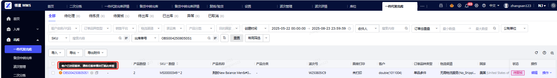 完成拣货的出库单会更新为“待复核”状态,请根据波次类型选择操作“二次分拣”或“复核验货”