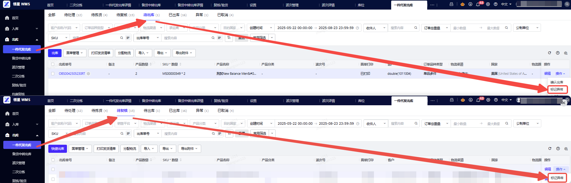 已标记异常的订单,会先进入【异常件】模块。仓库根据商品后续的维修情况或补充情况,确认订单是否可以继续操作出库。如果要继续出库,点击【移除异常】,订单恢复为原先的状态,仓库可继续操作;如果确认无法出库,点击【确认异常】,订单会更新为“异常”状态,需要通知客户在OMS二次确认并取消单据。