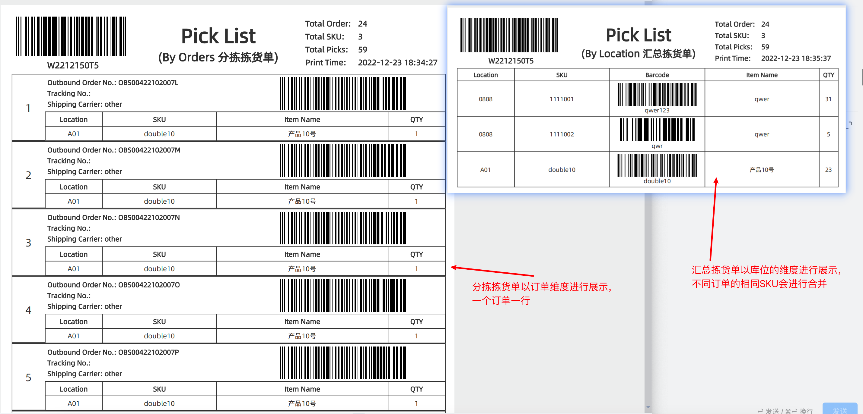 当前系统支持两种拣货单,分别为【分拣拣货单】和【汇总拣货单】
