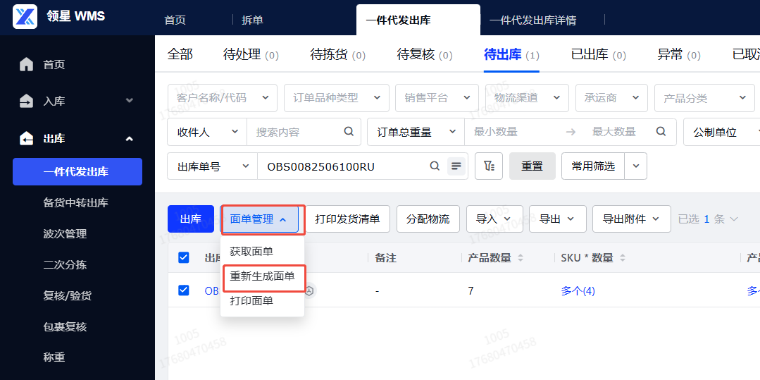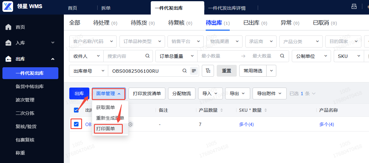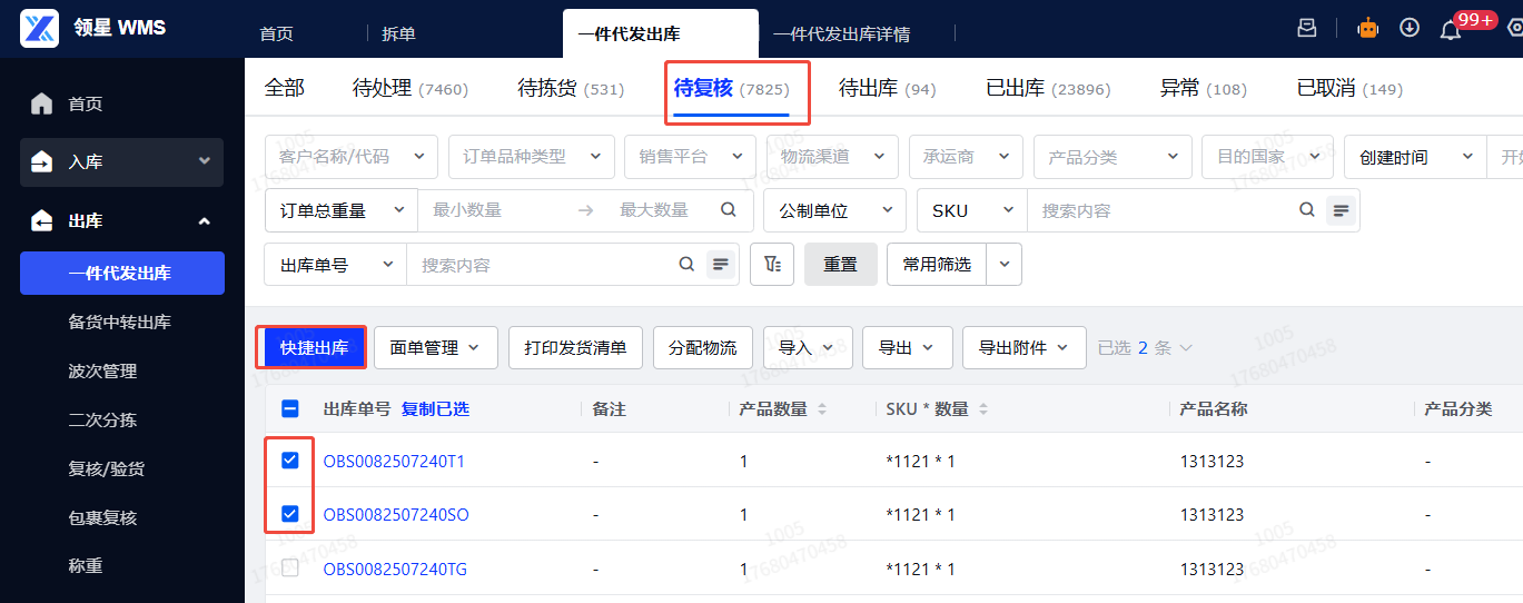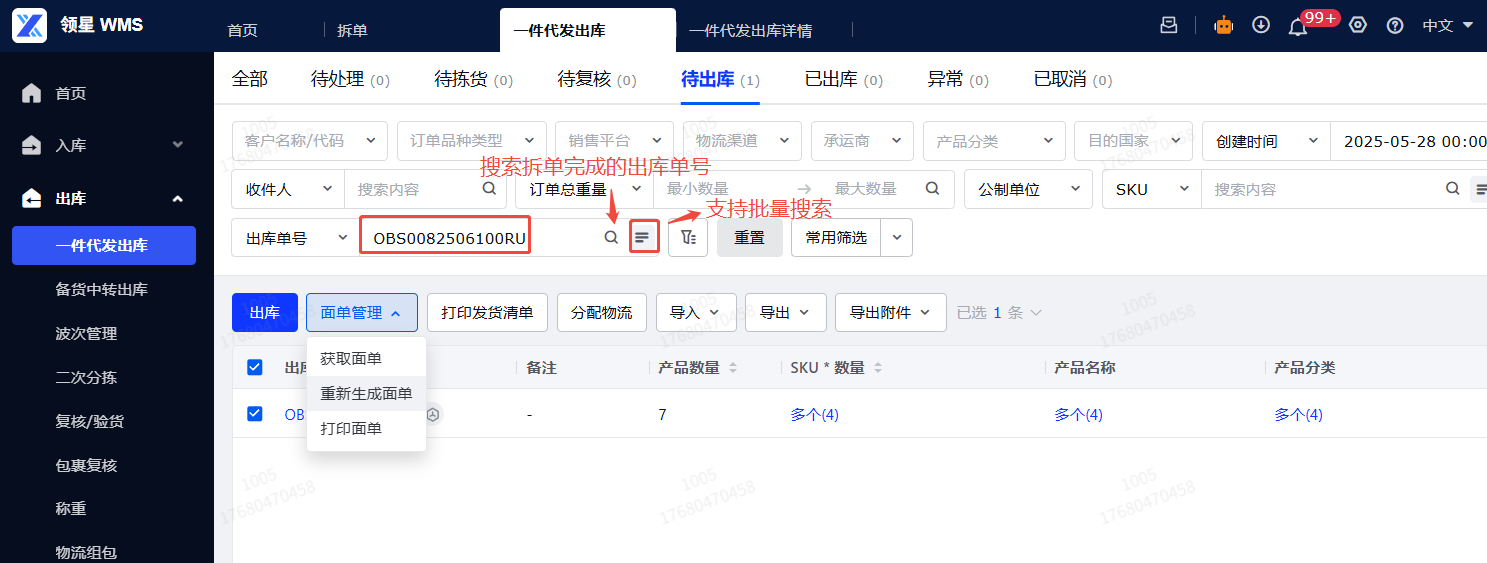 - 方案一:导航至出库菜单,进入一件代发出库模块,选择待复核/待出库状态;搜索已拆单完成订单的出库单号