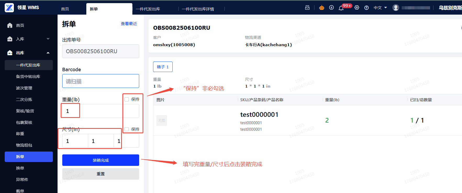 (5)填写新分装箱子的尺寸以及重量:保持按钮代表在分装下一个箱子时,按照当前填写的尺寸/重量自动填充