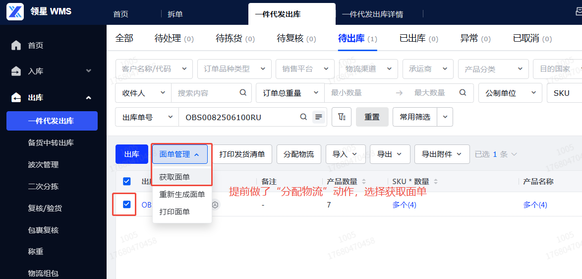 - 获取面单:指单据重新在 WMS 分配了渠道,可点击获取面单来获取新渠道的面单
