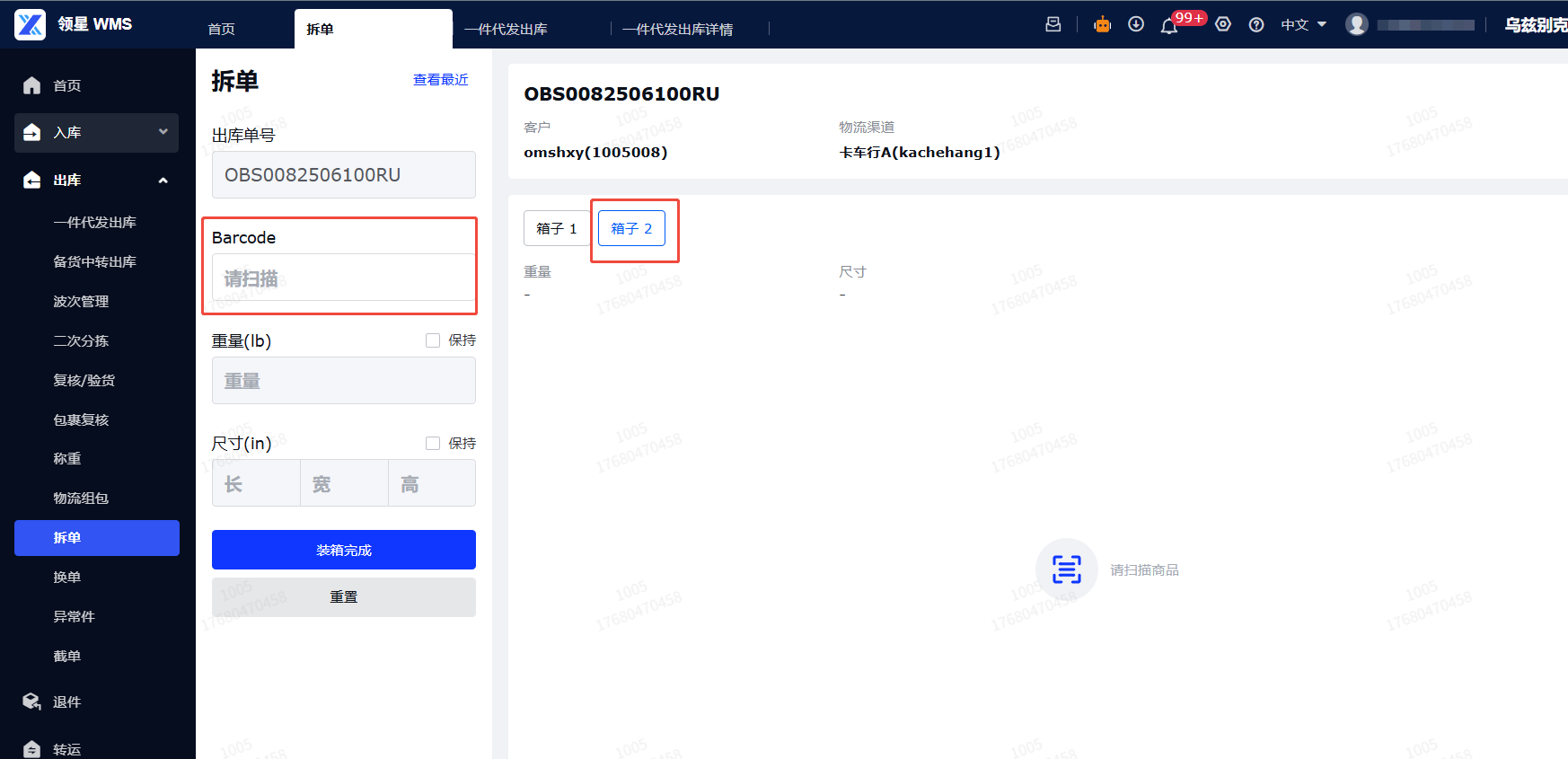 (6)重复上述(4)&(5)操作:扫描Barcode重复上述操作完成箱子2,箱子3,箱子4....直至所有Barcode装入箱子中