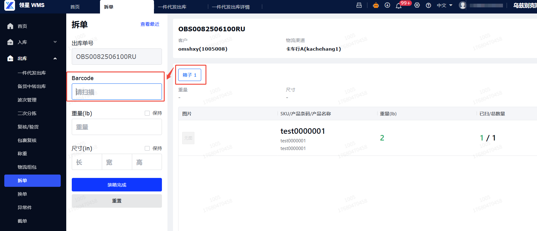 (4)填写/扫描分装箱子1中需要存放的产品Barcode:分装的箱子中支持存放多个Barcode,也支持仅存放一个Barcode(Barcode指的是产品的:SKU/产品主条码/其他条码/Fnsku)