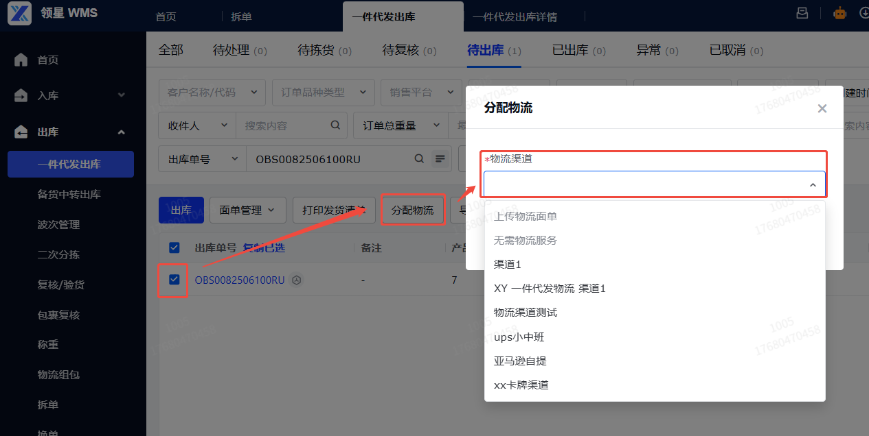 查询完毕,如需更换物流渠道可勾选订单点击分配物流按钮分配新的物流渠道(注:此操作流程为可选项目,如无需切换渠道此操作可跳过)