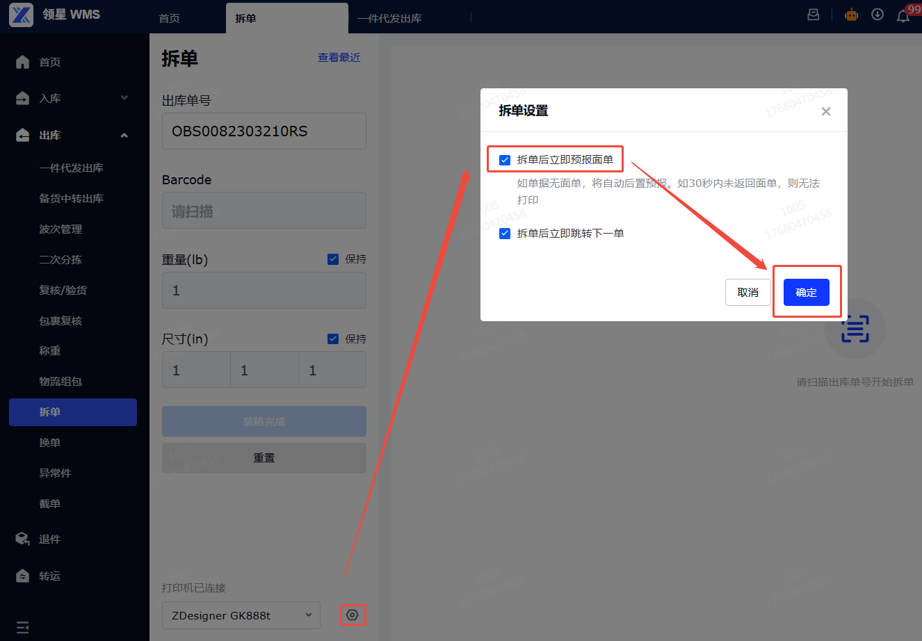 导航至拆单页面,进入设置的图标,勾选开启“拆单后立即预报面单”