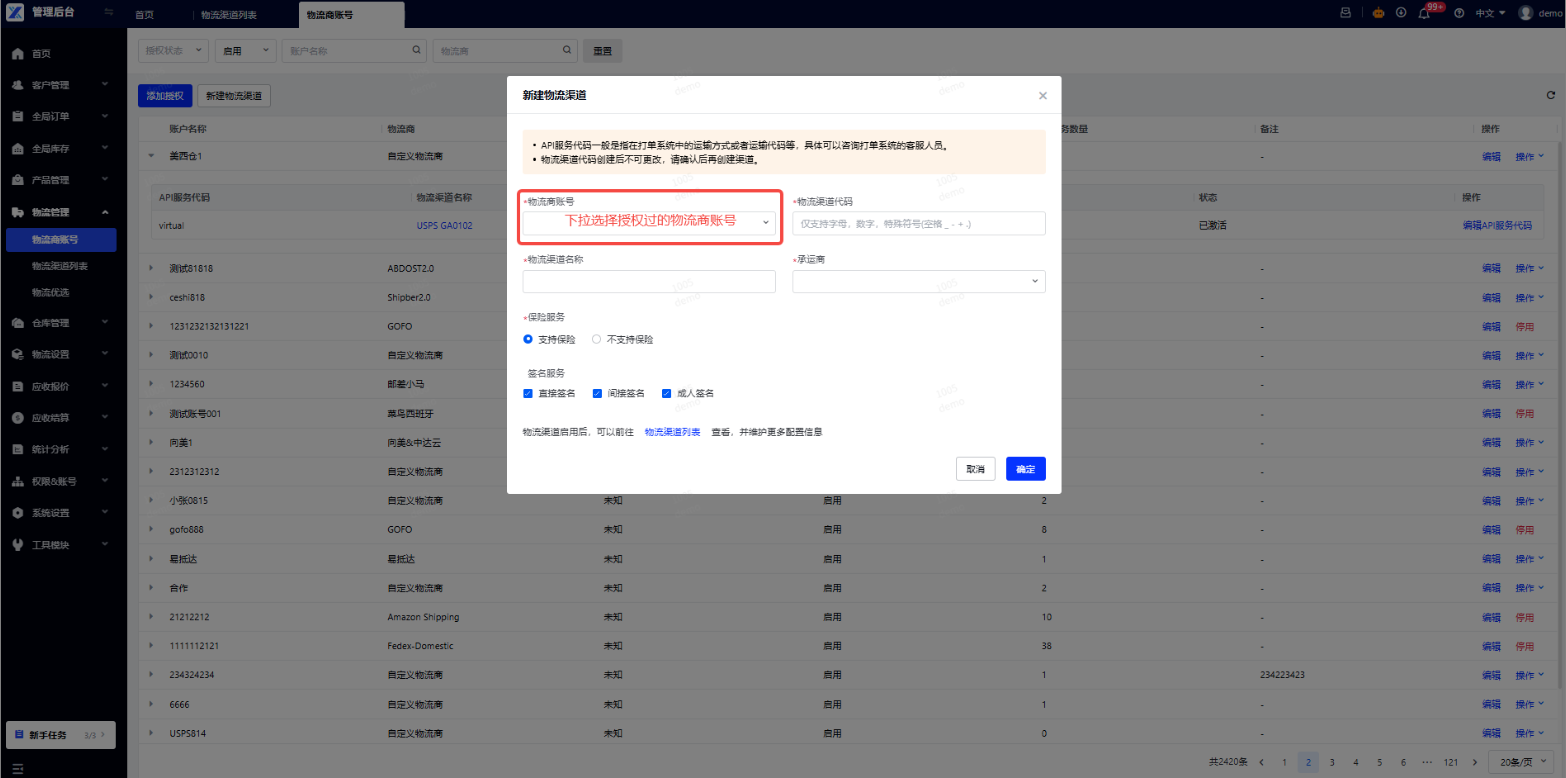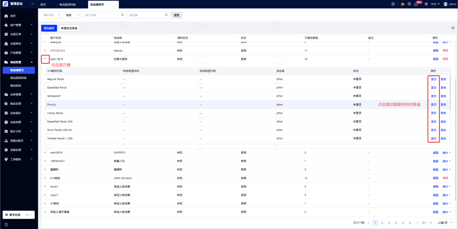 (2)新建物流渠道官方物流:官方物流已对接固定的物流渠道,授权官方物流商账号后,点击账户名称旁的展开键,可在列表中激活需使用的渠道。