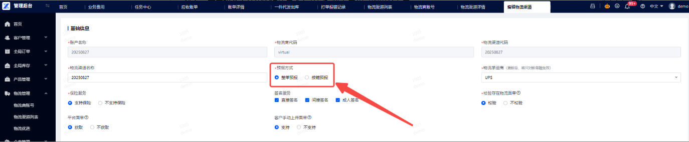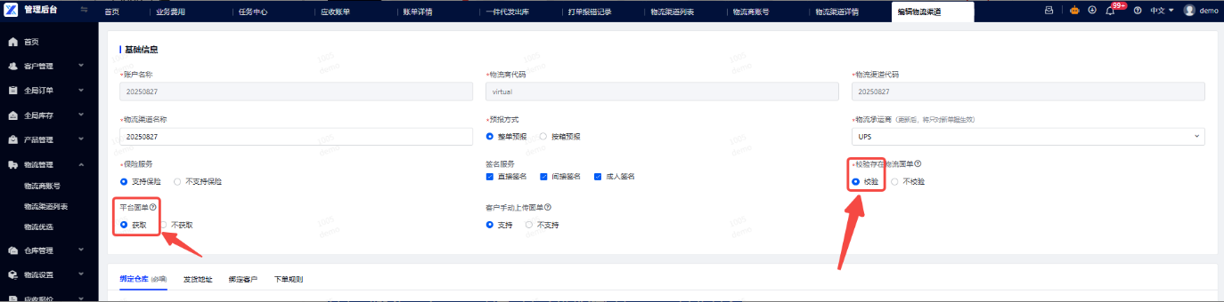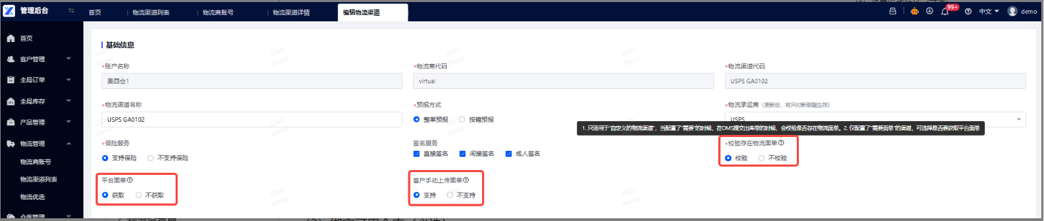 基础设置:保险服务/签名服务:勾选后,OMS客户下单时,可以选到对应的服务,取消勾选则无法下单对应签名服务。校验存在物流面单:只适用于“自定义的物流渠道”,当配置了"需要"的时候,在OMS提交出库单的时候,会校验是否存在物流面单;一般用于仓库自提、仓配分离(即不用仓库的物流渠道)等情况。勾选校验后,将展示【平台面单】选项,勾选“获取”,则在【OMS-平台订单】中分配物流时,可以通过该物流渠道去获取平台面单。若客户不使用平台面单,也不使用仓库面单,有自己的打单渠道,可勾选“支持”客户手动上传面单。