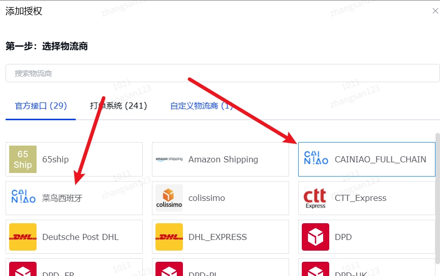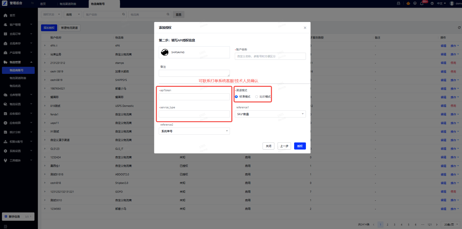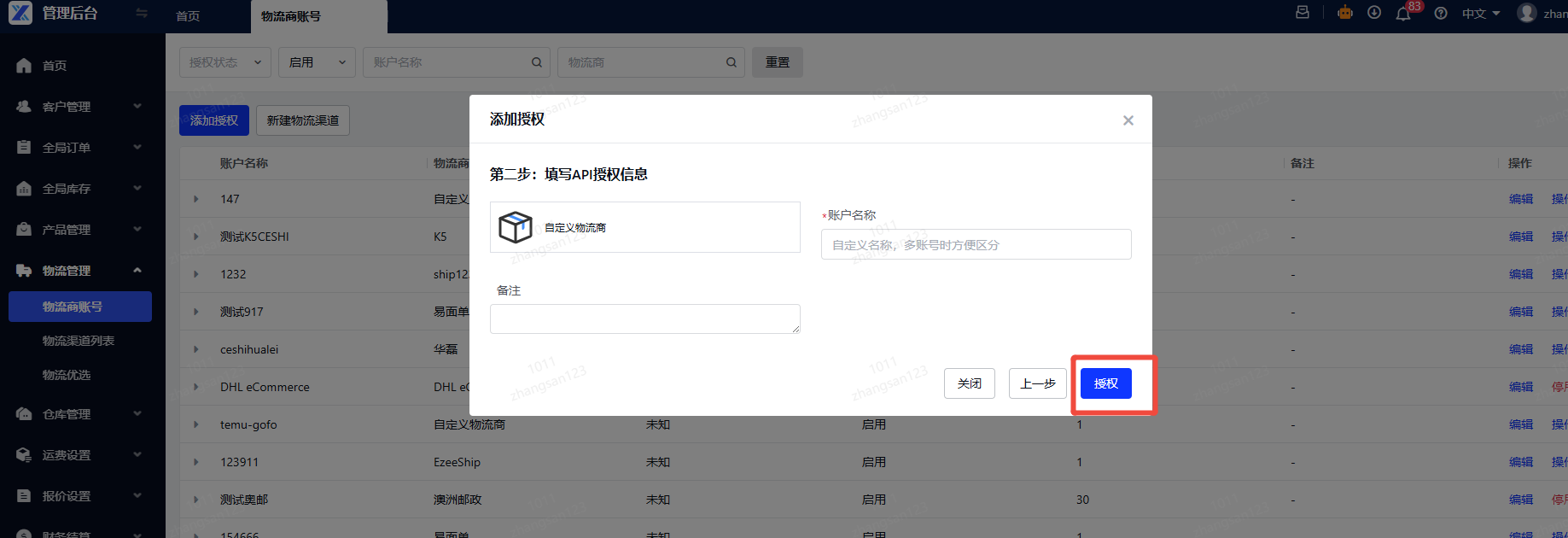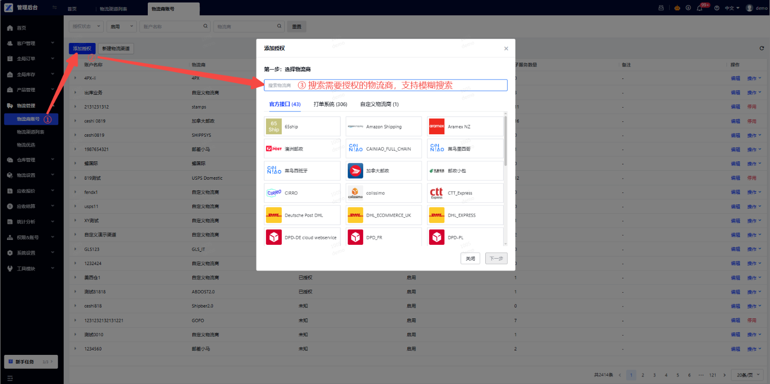 (1)物流商账号授权:进入OMP 管理后台,点击物流管理 -物流商账号 -添加授权 ,选择需要授权的物流商 (可选择官方接口、打单系统或者自定义物流商),点击下一步,填写授权信息。每个物流商的授权界面内容不一样,可在打单系统的界面中寻找授权信息,如果无法确认,请联系物流商工作人员。