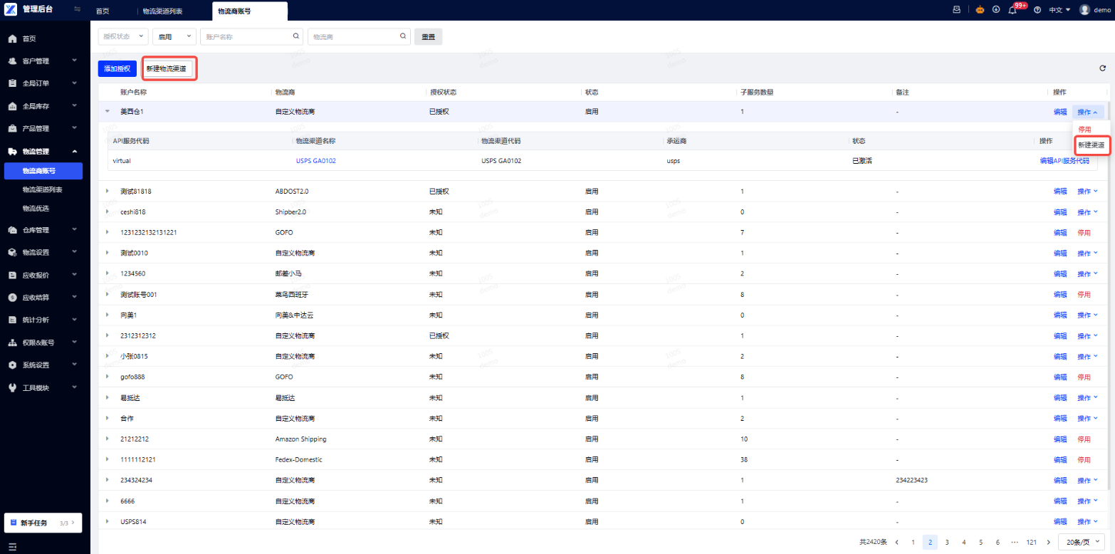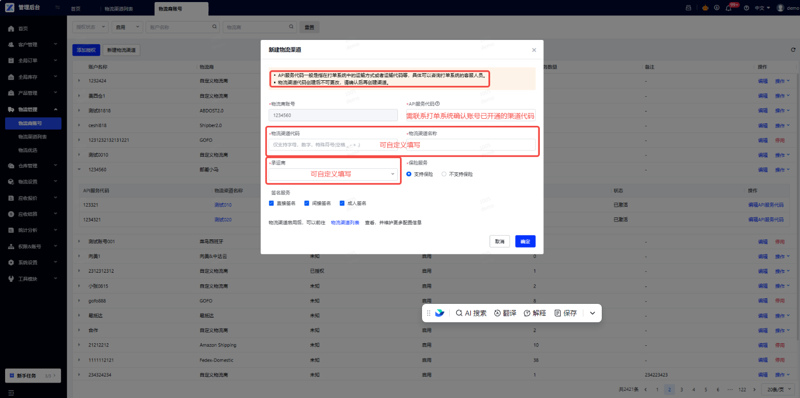 打单系统:点击新建物流渠道或者在授权的物流商账号右侧点击操作-新建渠道,并填写渠道信息。