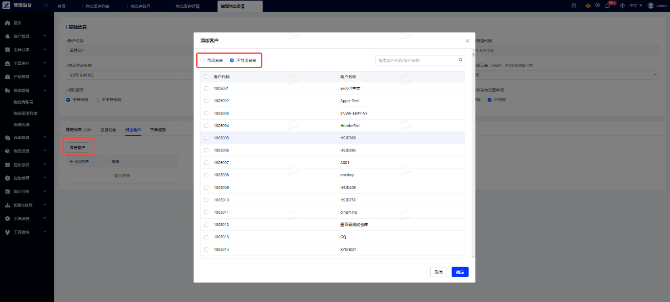 绑定客户(可选):物流管理-物流商渠道列表,选择需配置的物流渠道,在右侧点击编辑-绑定客户。注意:如您需要把渠道开放给所有客户,请切换到【不可用名单】并不选择任何客户,然后点击确定。