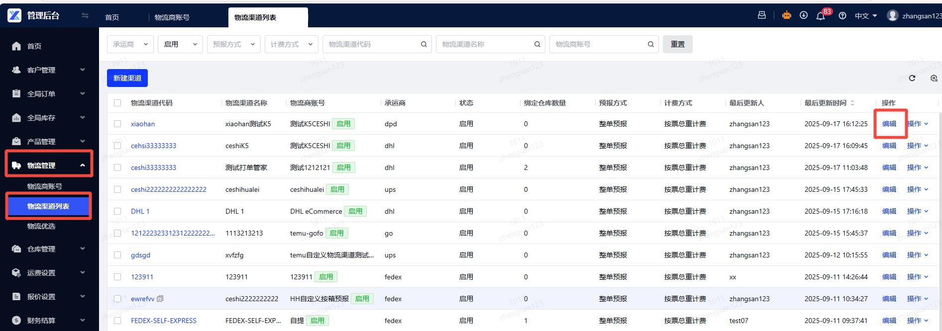(3)配置物流渠道路径:物流管理 -物流渠道列表 ,选择需配置的物流渠道,在右侧点击编辑。