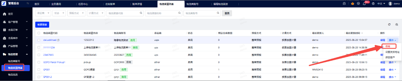 Q4:渠道设置了按箱预报,备货中转出库选择按产品出库只会获取一个面单嘛?答案:是的。Q5:物流渠道已绑定仓库也设置了可用名单,但是oms一件代发出库单时,选择不到对应的渠道?答案:一件代发出库单的渠道列表不展示按箱预报的自定义物流商渠道、不支持客户上传物流面单的渠道。Q6:禁用特定的物流渠道?答案:可以在omp-物流渠道列表-停用